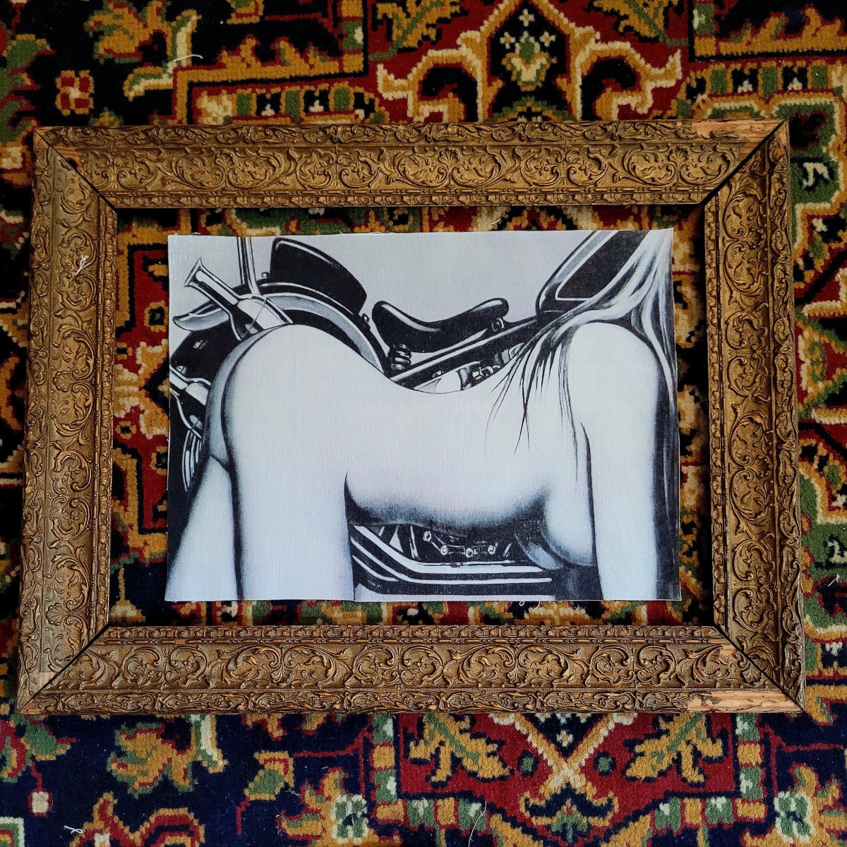 Backpatch « Curves Body Motorcycle » printed on old cotton canvas. To be sew on jackets or to putt on wall.