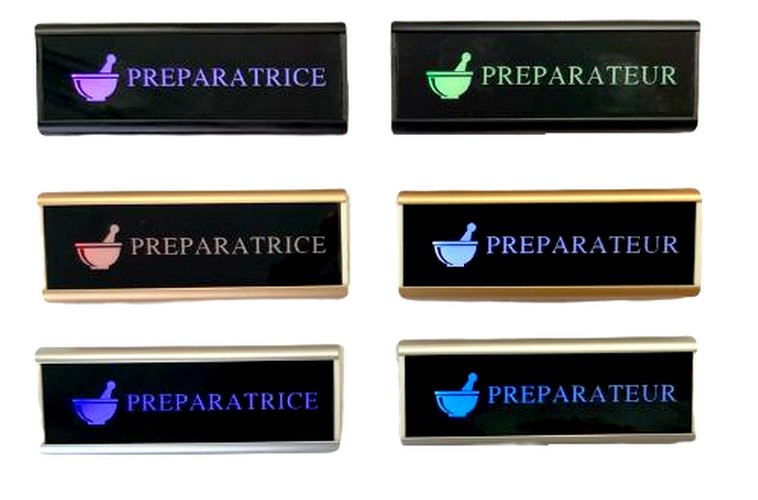 Pratique et moderne, ce badge rétro éclairé à led MULTICOLORE est innovant. Le badge Nildor à LED, PREPARATRICE ou PREPARATEUR se charge via le câble USB fourni : charge de 1 à 2h pour 48 heures d’autonomie. Il vous est proposé dans 3 cadres différents: NOIR, GRIS ou CUIVRE. Avec ce badge, vous avez la possibilté de choisir parmi 6 couleurs fixes d’écriture ou bien en version clignotante multicolore. Peut aussi être porté sans rétro-éclairage.