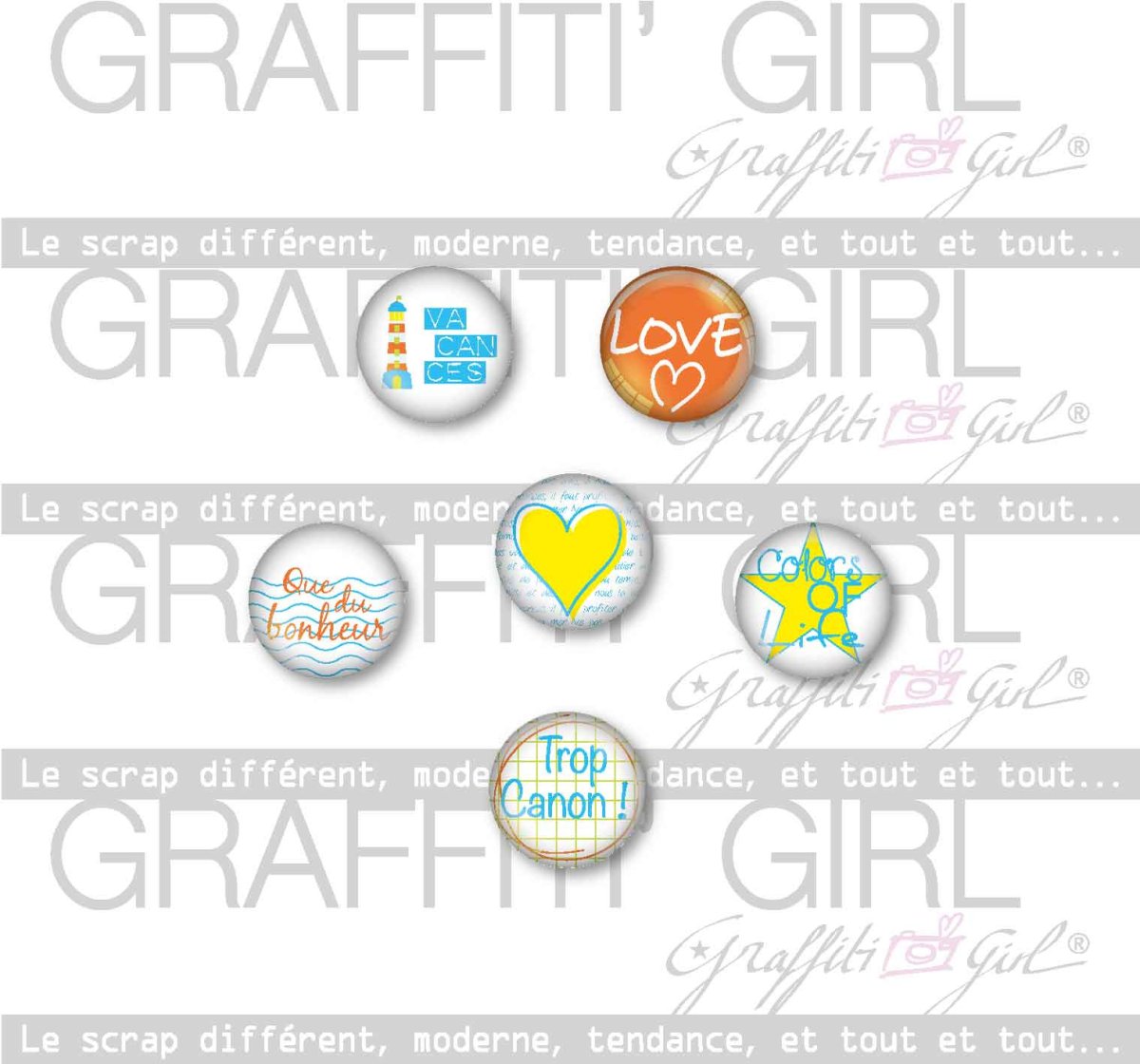 Nom: Coup de soleil Produit: Badges Taille: diamètre de 2,5 cm Marque: Graffiti Girl Collection: Coup de soleil Le petit plus: Vendus dans une pochette de papier kraft recyclé, A7. Utilisation: Dos plat, s’utilise avec double face ou mousse 3D (non fournis).