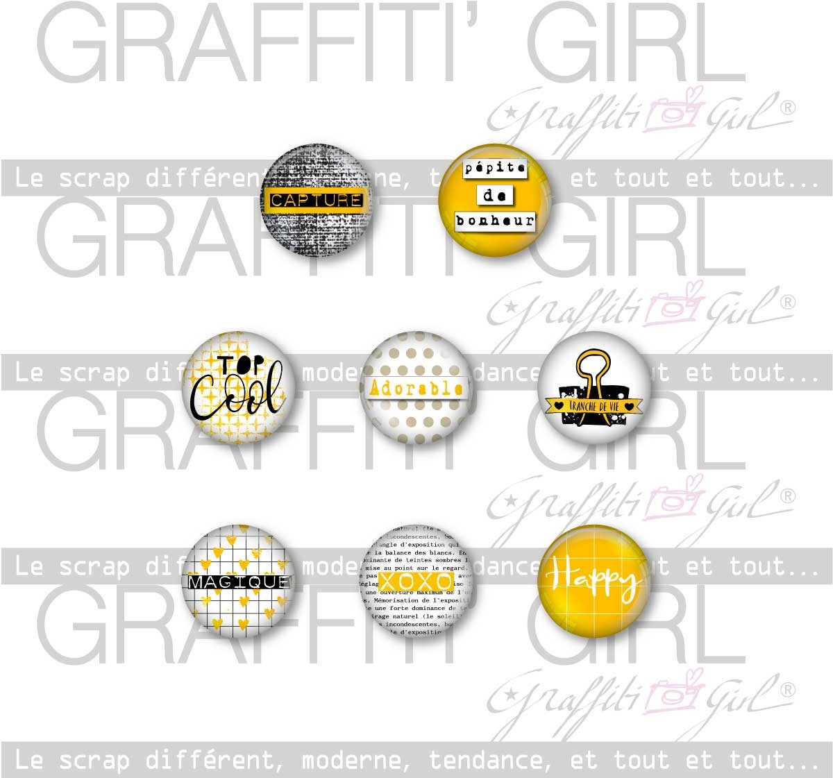 Nom: Cury Jolie Produit: 8 Badges Taille: diamètre de 2,5 cm Marque: Graffiti Girl Le petit plus: Vendus dans une pochette de papier kraft recyclé, A7. Utilisation: Dos plat, s’utilise avec double face ou mousse 3D (non fournis).