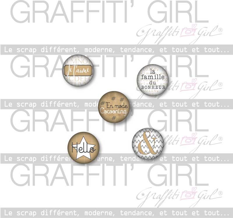 Nom: Lovely kraft Produit: Badges Taille: diamètre de 2,5 cm Marque: Graffiti Girl Collection: Lovely kraft Le petit plus: Vendus dans une pochette de papier kraft recyclé, A7. Utilisation: Dos plat, s’utilise avec double face ou mousse 3D (non fournis).