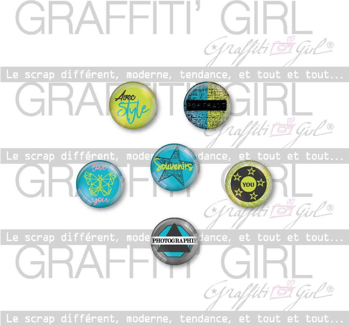 Le lot d’embellissements badges scrapbooking Moderne appartient à la marque Graffiti Girl et se compose de six badges. Dans un combo de couleurs bleu et vert, ce set de badges tourne autour du thème de la photographie avec les badges mots photographie, portrait et avec style. Ils se marieront alors très bien avec une page de scrap avec photo. Deux autres badges étoiles complètent l’ensemble pour le plaisir de tout le monde. Ces badges Moderne sauront donc être de très bons embellissements indispensables pour affiner votre création de scrapbooking.