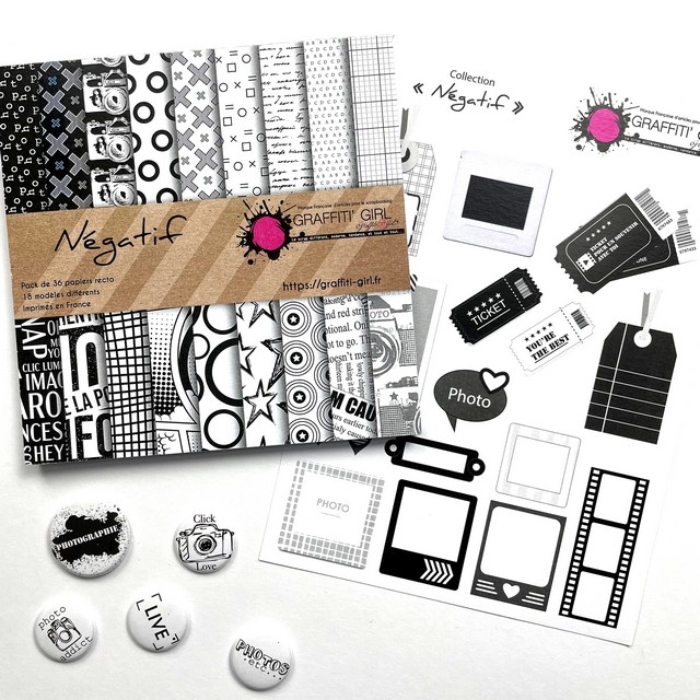 Un lot de badges, assortis à la collection Négatif, ils sont cinq, et sont trop cutes, ils vont venir agrémenter et décorer tous vos projets de scrap, apporteront de l’épaisseur à vos minis- albums, ou sublimeront vos couvertures d’albums, ou bullet journal. On aime +++