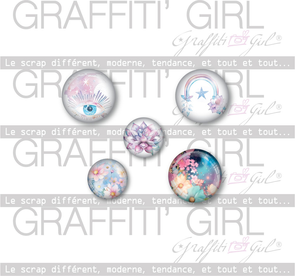 Nom: Sérénité astrale Produit: 5 Badges Taille: diamètre de 2,5 cm et 3,2 cm Marque: Graffiti Girl Collection: Sérénité astrale Le petit plus: Vendus dans une pochette de papier kraft recyclé, A7. Utilisation: Dos plat, s’utilise avec double face ou mousse 3D (non fournis).