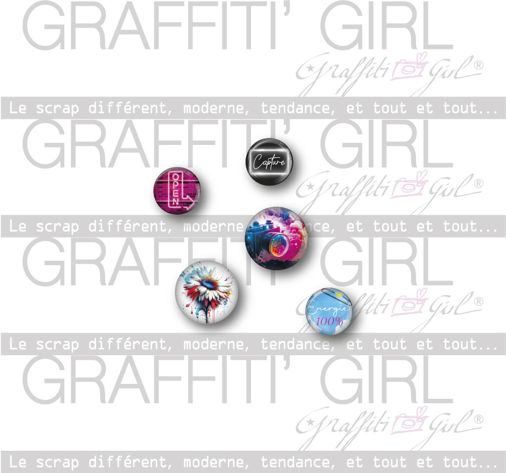 Nom: Surtension Produit: 5 Badges Taille: diamètre de 2,5 cm et 3,2 cm Marque: Graffiti Girl Collection: Surtension Le petit plus: Vendus dans une pochette de papier kraft recyclé, A7. Utilisation: Dos plat, s’utilise avec double face ou mousse 3D (non fournis).