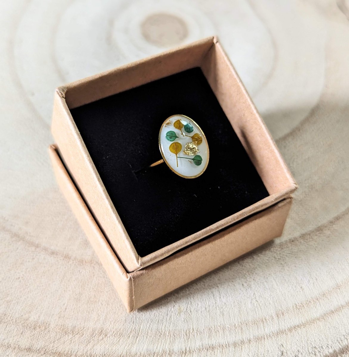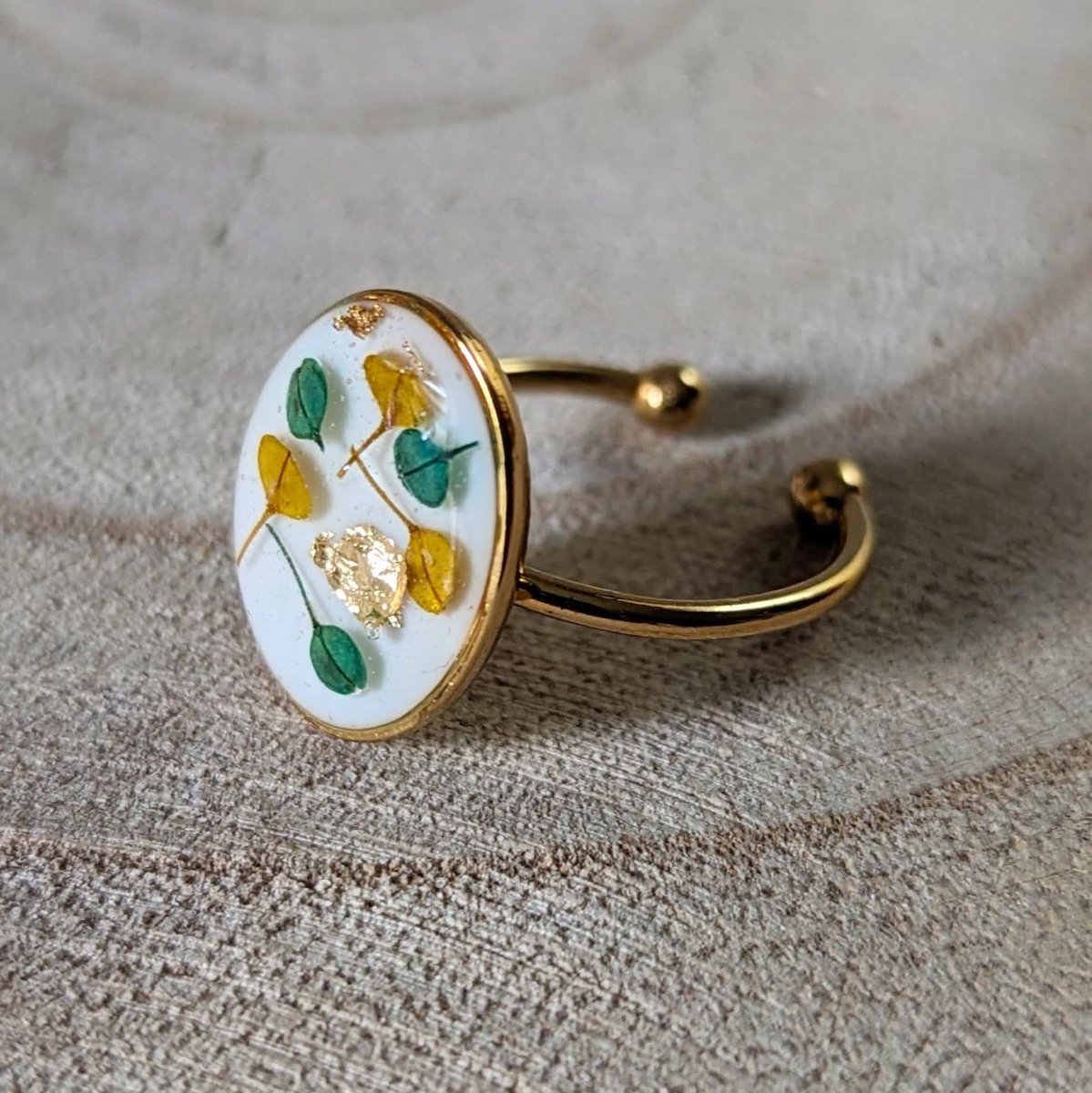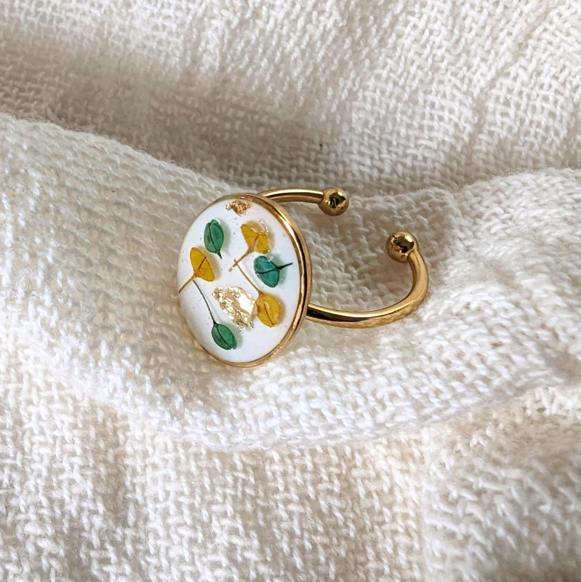 Bague artisanale en fleurs stabilisées aux tons jaunes, verts et blancs, Ingrid