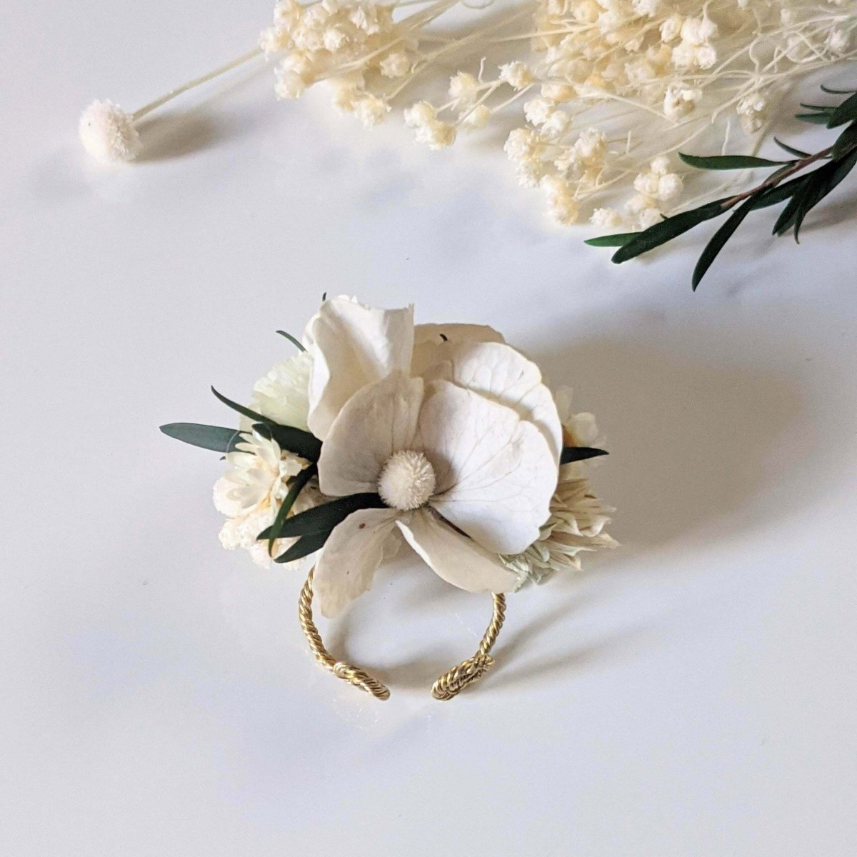 Bague de mariée artisanale en fleurs séchées & fleurs stabilisées, Inès