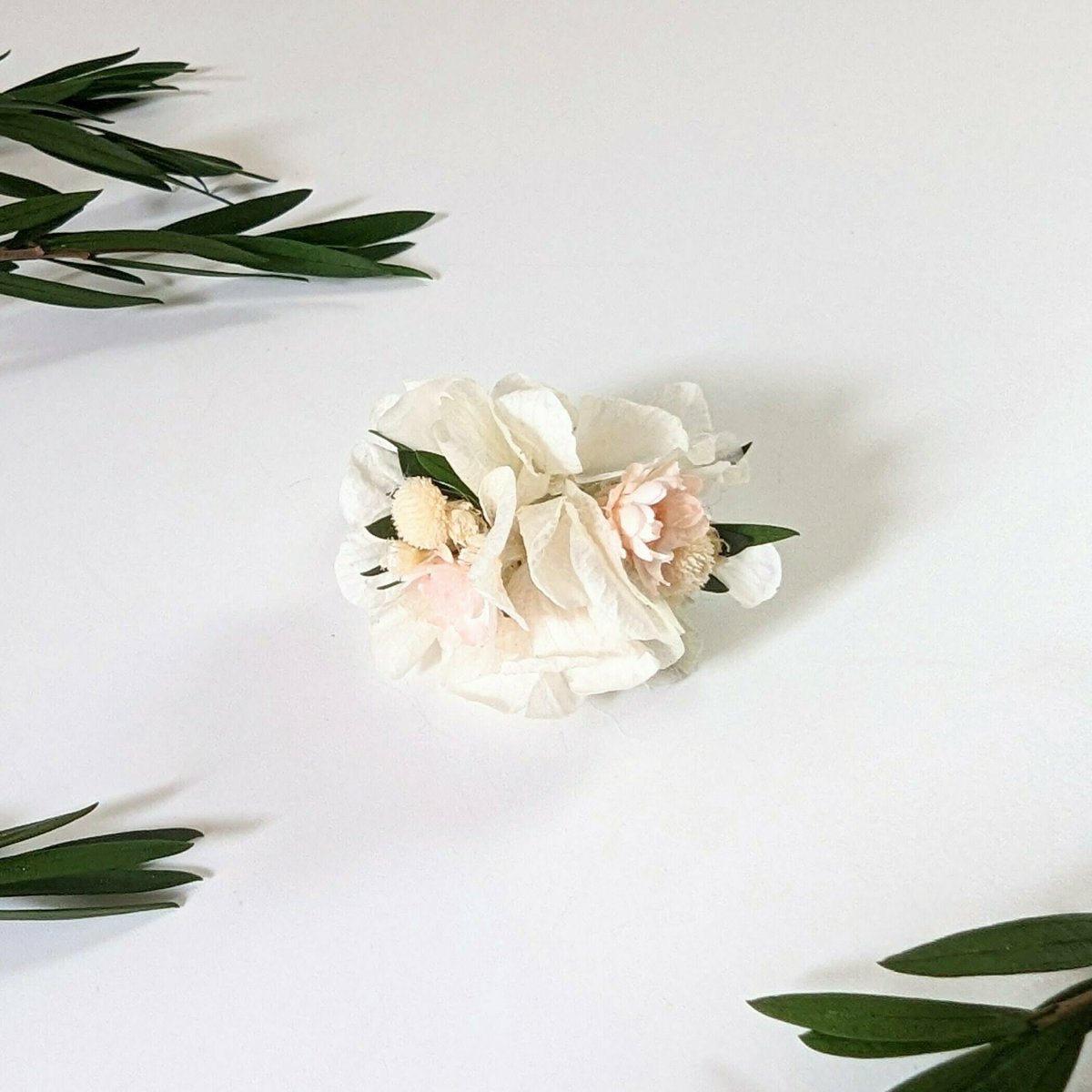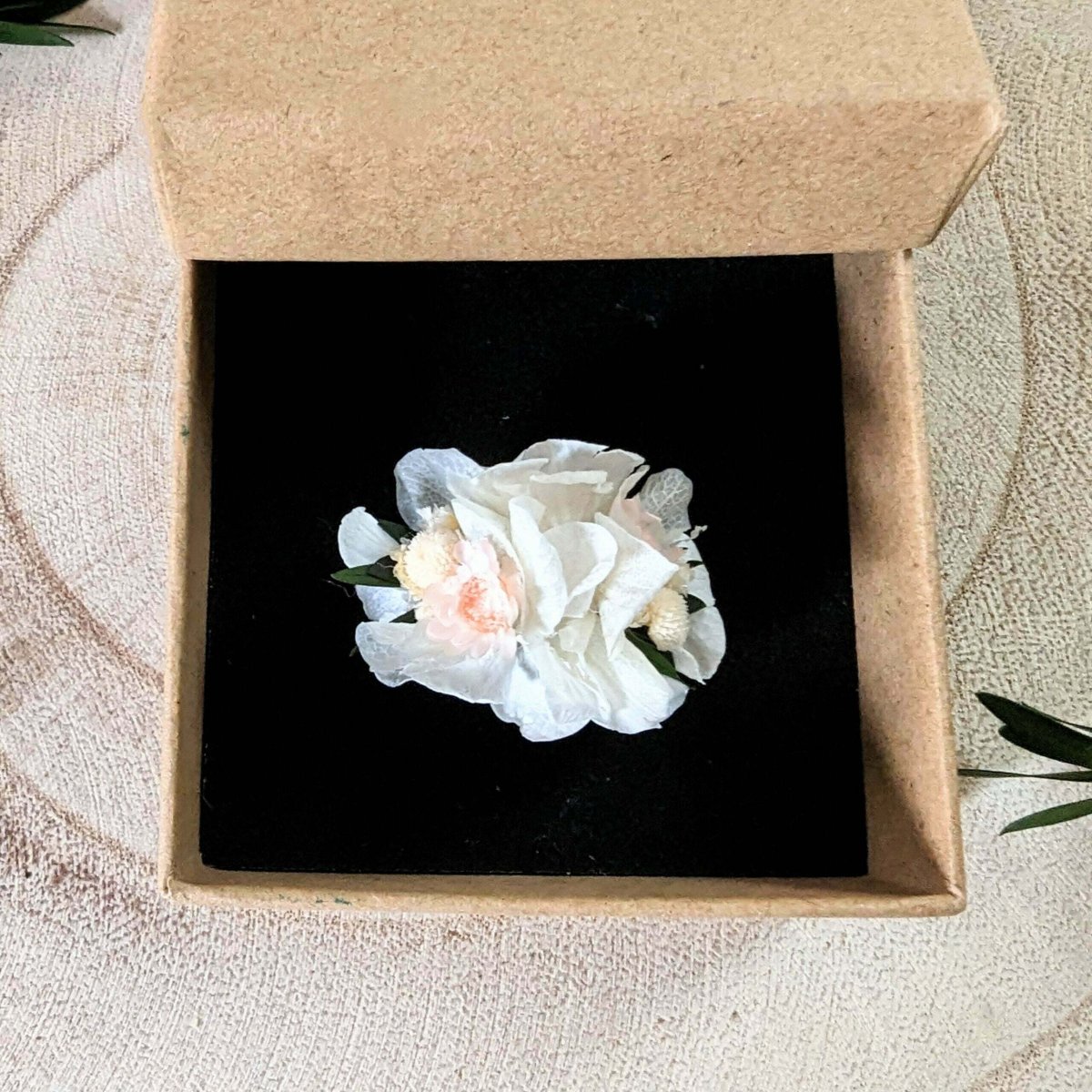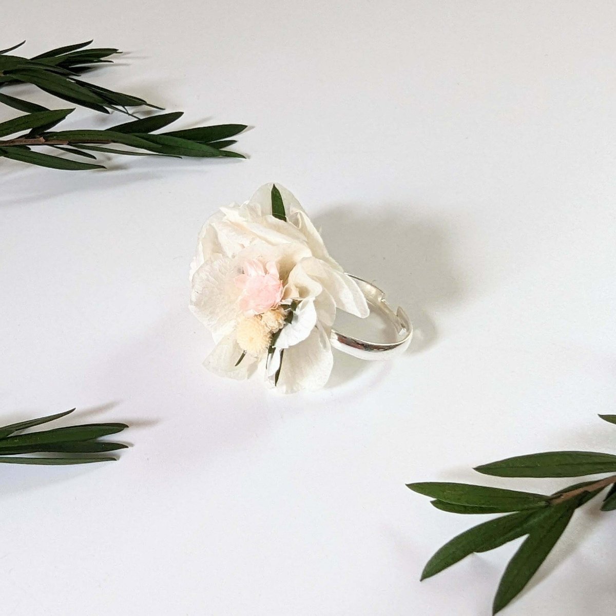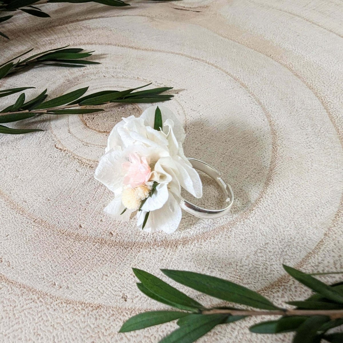 Bague de mariée artisanale en fleurs séchées & stabilisées blanches & roses, Rafaela