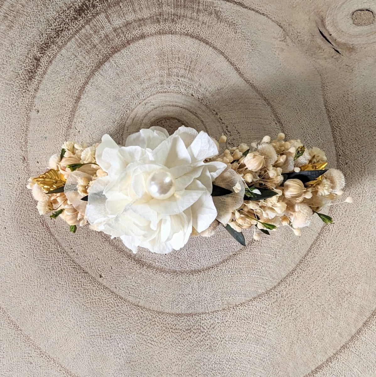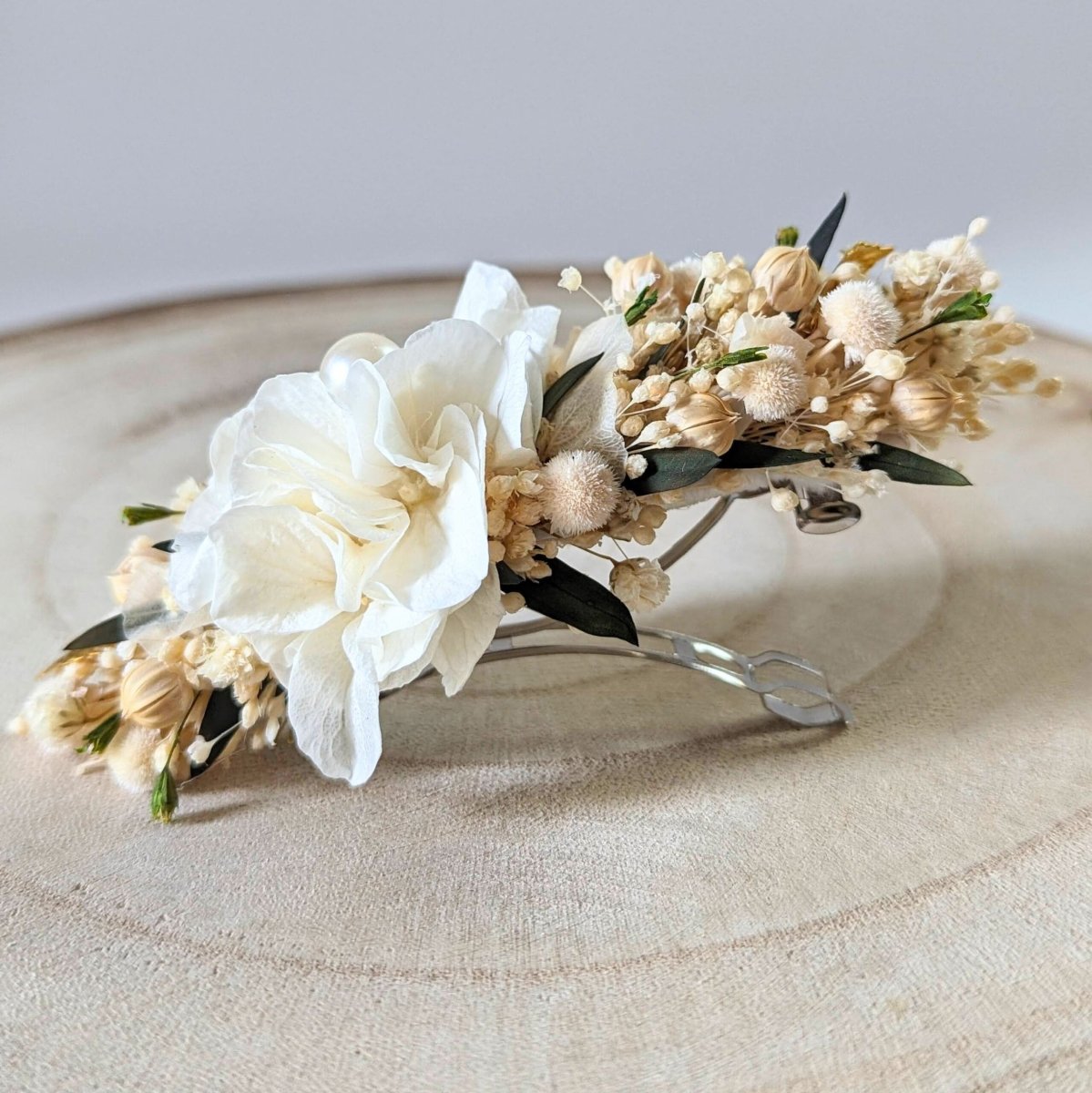 Barrette à cheveux fleurie pour coiffure de mariage en fleurs stabilisées blanches & vertes, Virginie