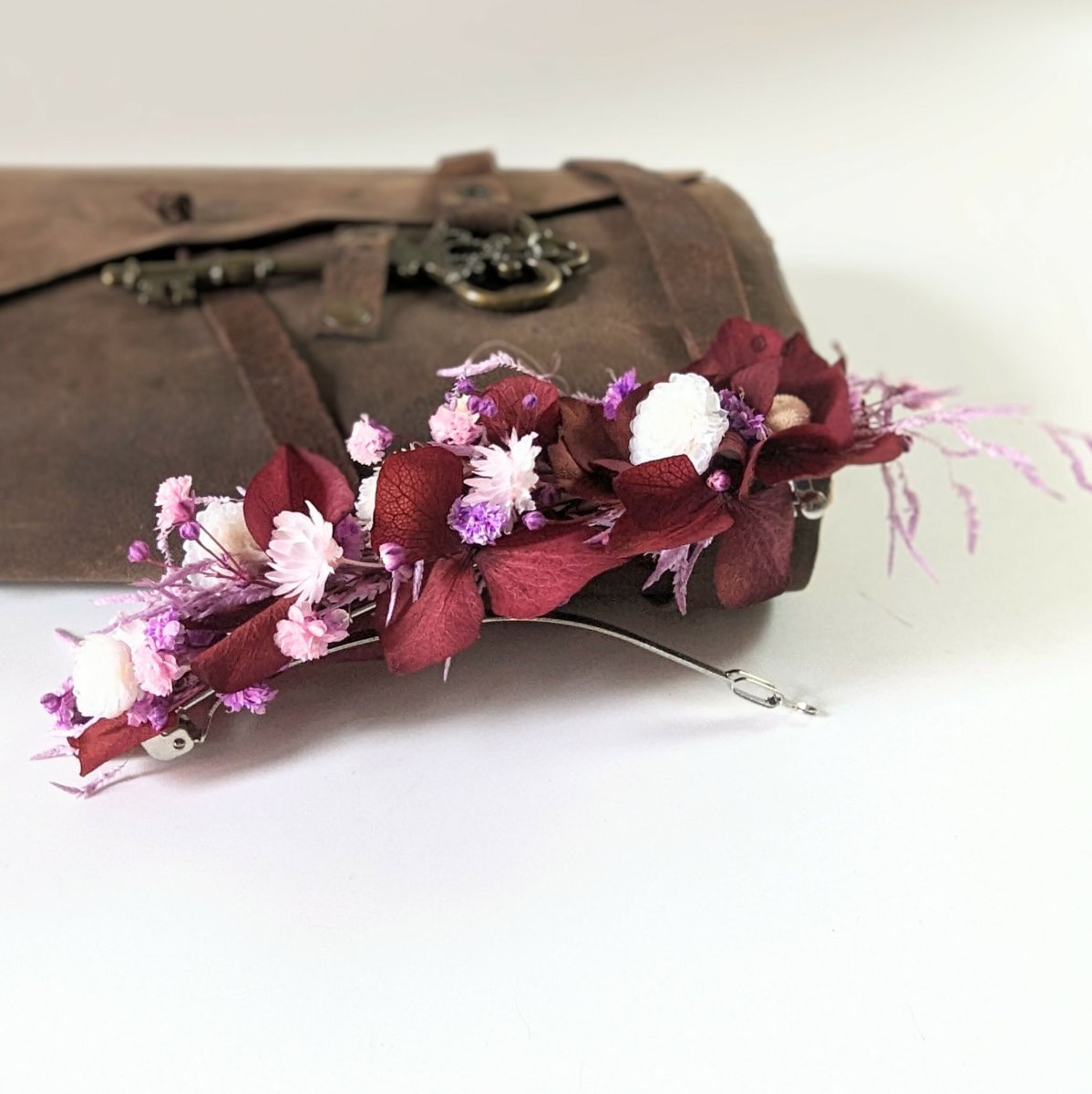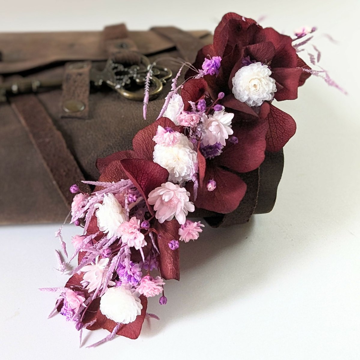 Barrette à cheveux fleurie pour coiffure de mariage en fleurs stabilisées bordeaux & blanches, Betty
