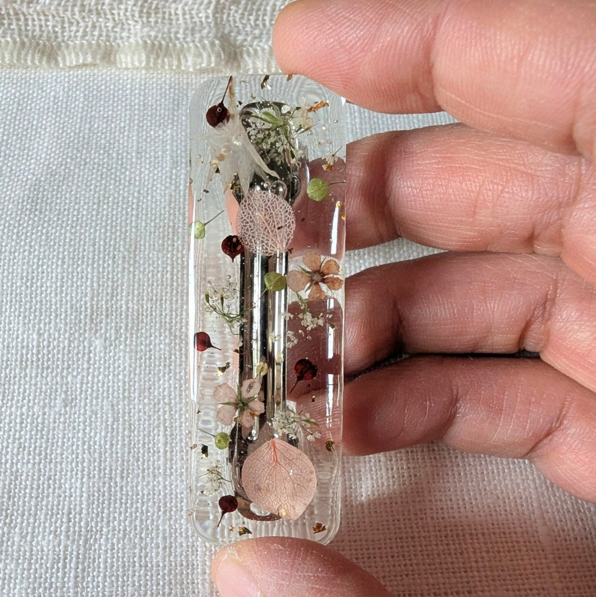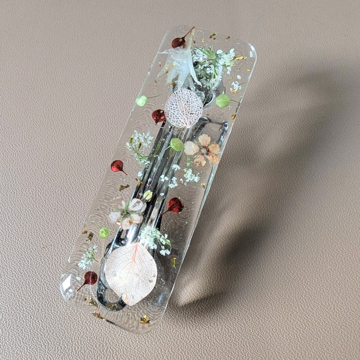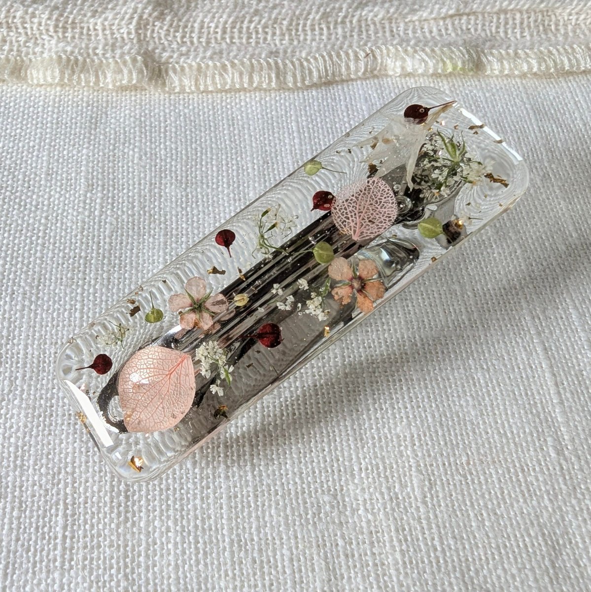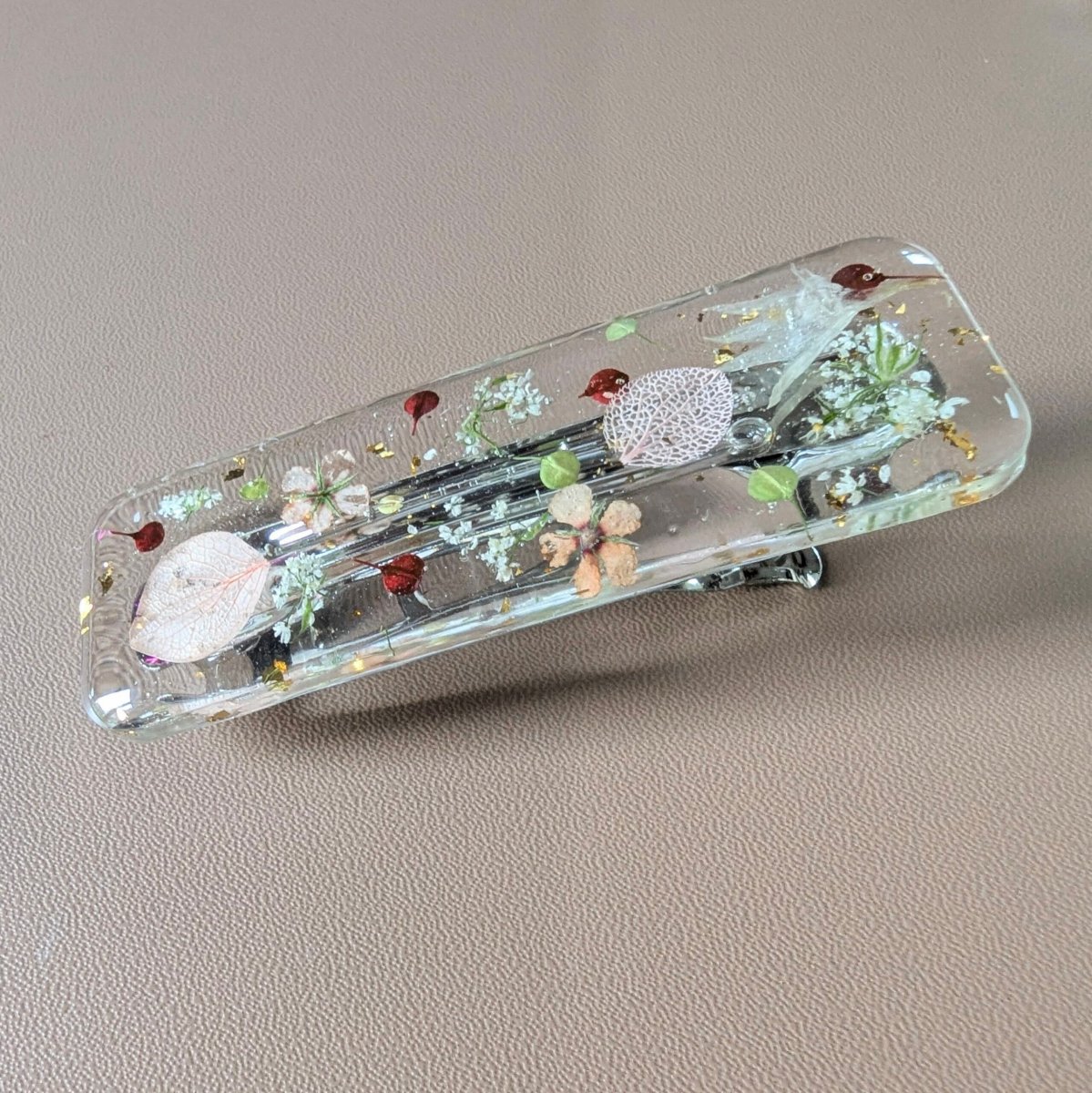 Barrette en résine transparente et fleurs séchées, création artisanale, Ophélie