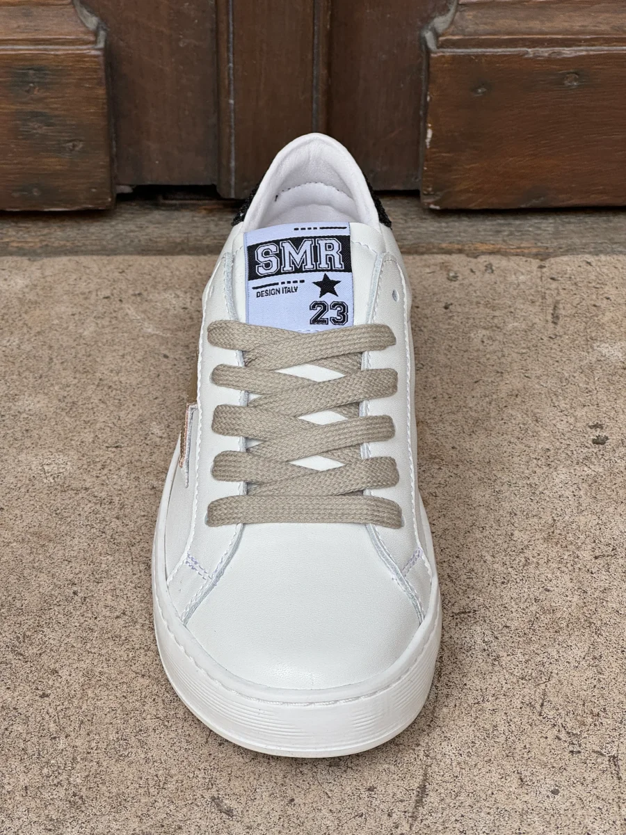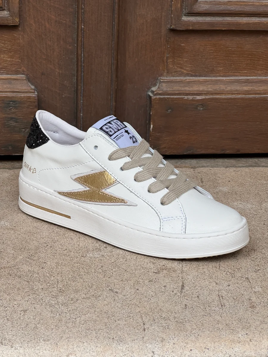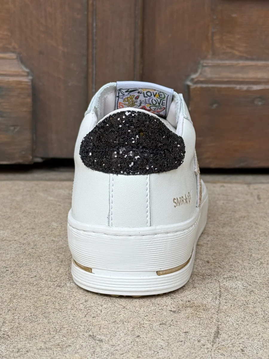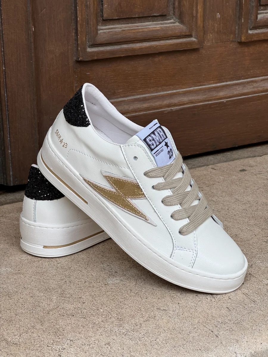 À l’arrière, la finition noire pailletée attire le regard et met en valeur le logo SMR 23 doré positionné sur le côté arrière de la chaussure. Le dessous de semelle doré vient parfaire ce modèle lumineux. Cette basket Semerdjian, marque française, est fabriquée au Portugal, garantissant un savoir-faire européen et des finitions soignées.