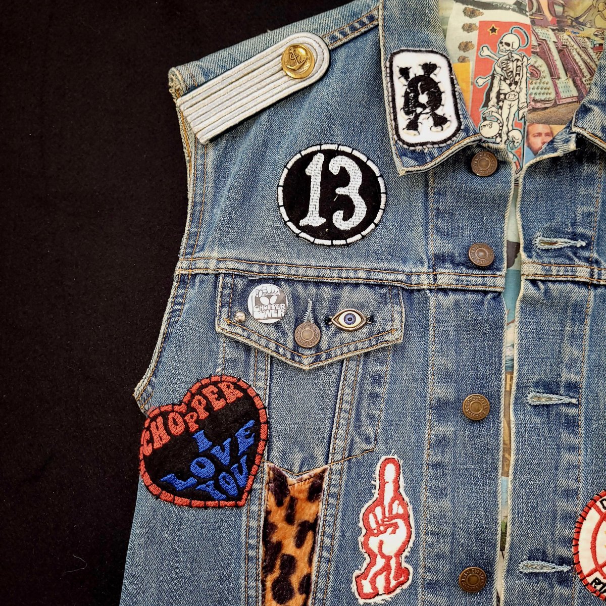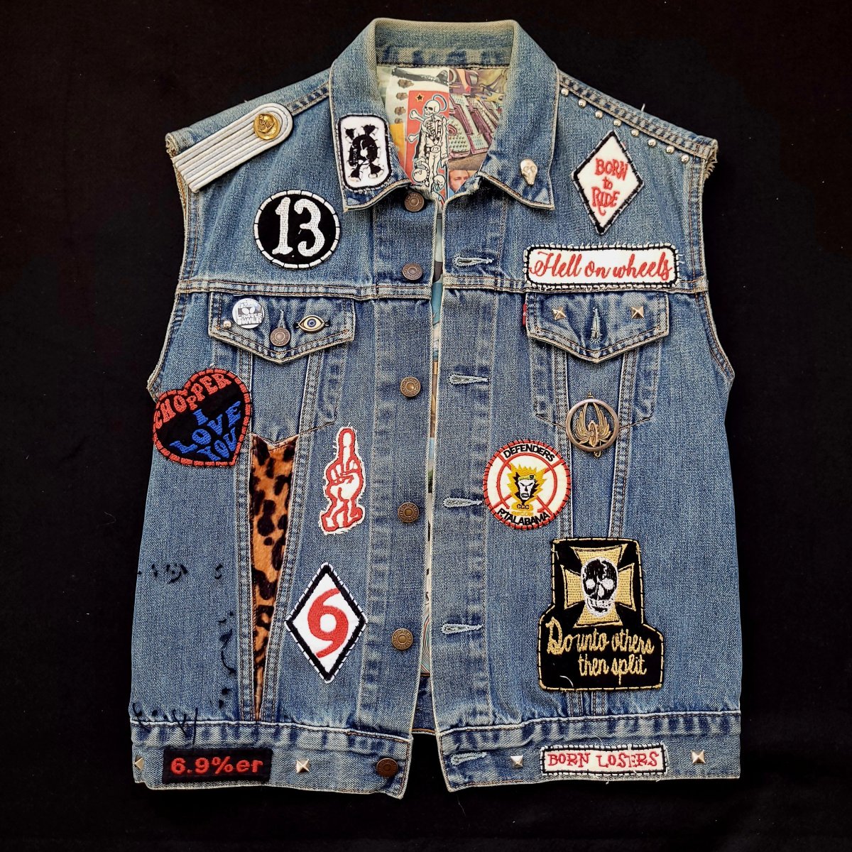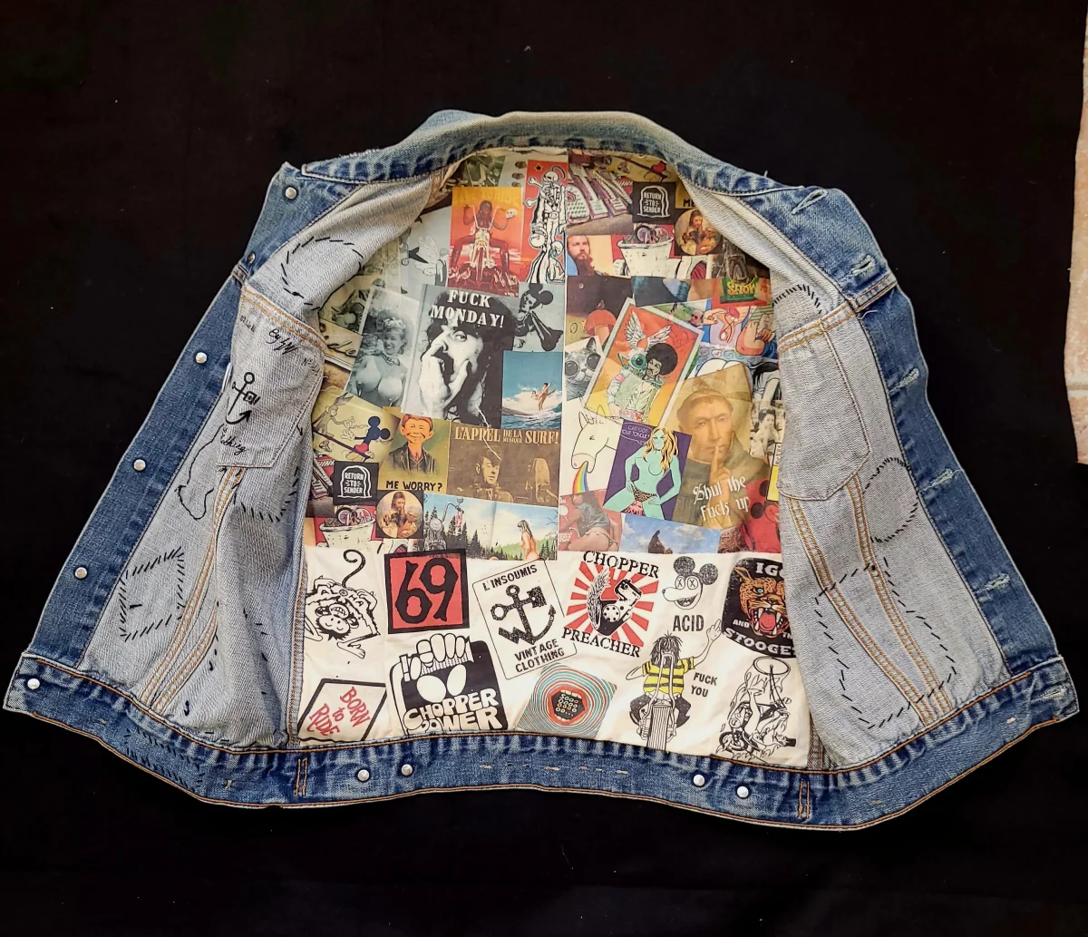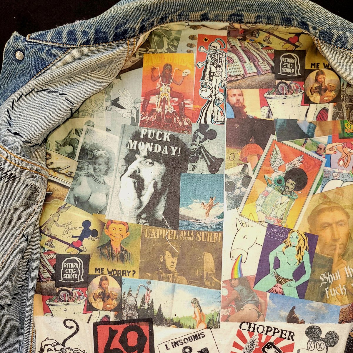 Levis cut handembroidered on the theme from CC&Company B biker movie from 70’s. This logo we did by chainstitch is a logo that doesn’t belongs to any clubs from the to today, it was just created for the movie. The liner inside isprinted with sin stuff we just found through time on the web and old magazines. Just need your touch now.