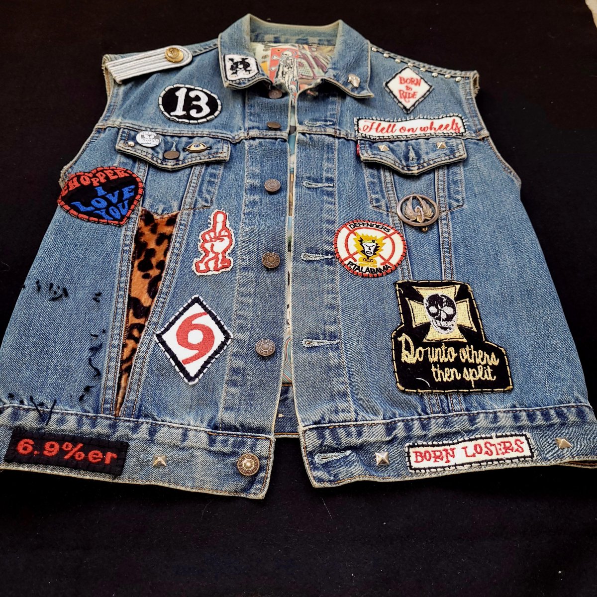 Veste Levis sans manches brodée à la main sur le thème du film CC & Company, un film de série B sur les gangs de motards des années 70, le logo a été crée expressément pour ce film et n’appartient à aucun club passé ou actuel. L’intérieur est doublé et imprimé par nous avec pleins d’images fantasmantes, trouvailles au fil du temps sur le net et vieux magazines.