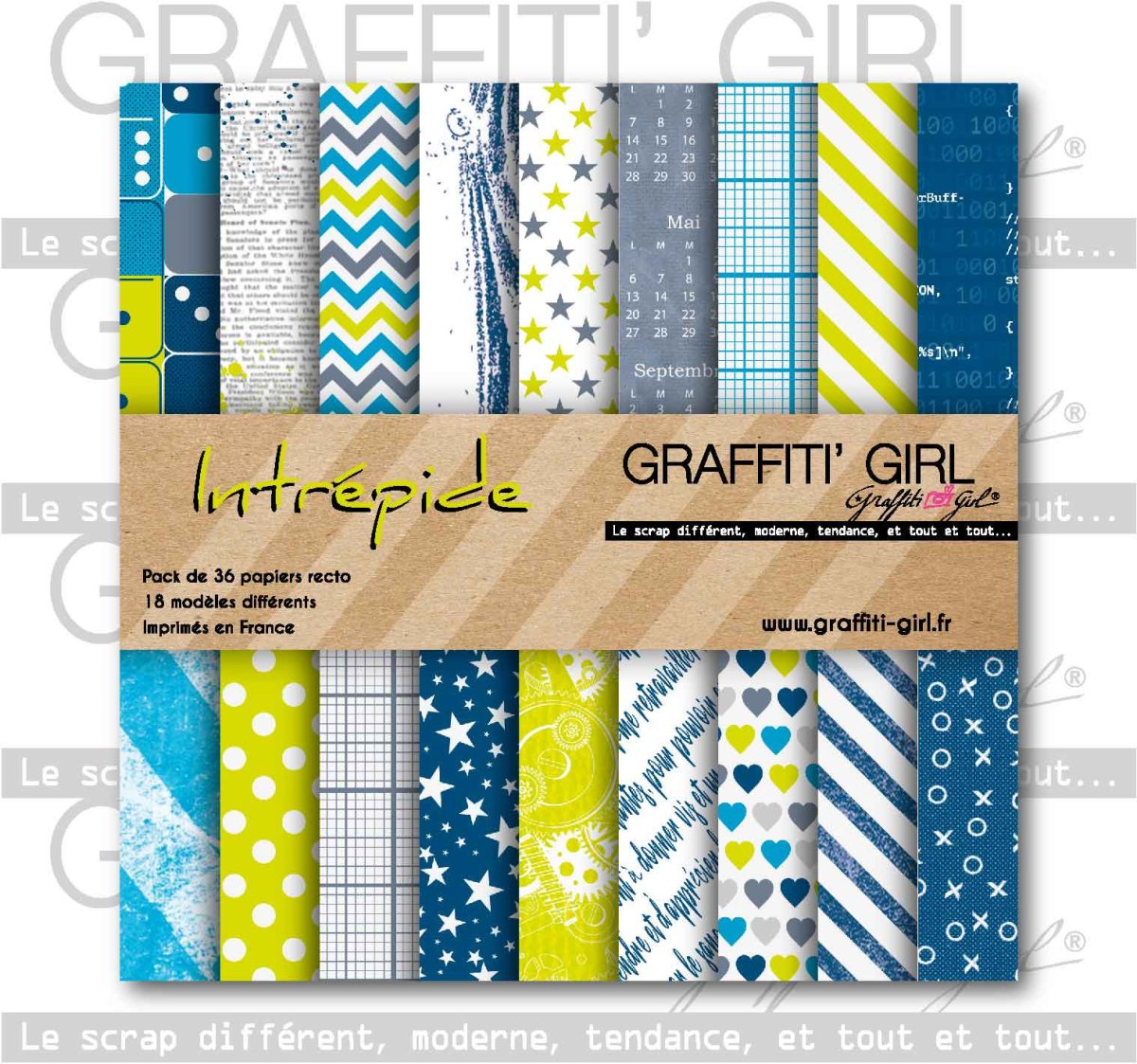 Nom: IntrĂ©pide Produit: Papiers Taille: Bloc de 36 feuilles 170 gr, recto, format 15×15. Marque: Graffiti Girl Collection: IntrĂ©pide Le petit plus: Combo de couleur coordonnĂ©s Ă la collection. Utilisation: DĂ©coupĂ©, dĂ©chirĂ©, tamponnĂ©, encrĂ©, en structure d’album, comme en page de scrapbooking ou tout autre loisirs crĂ©atifs.