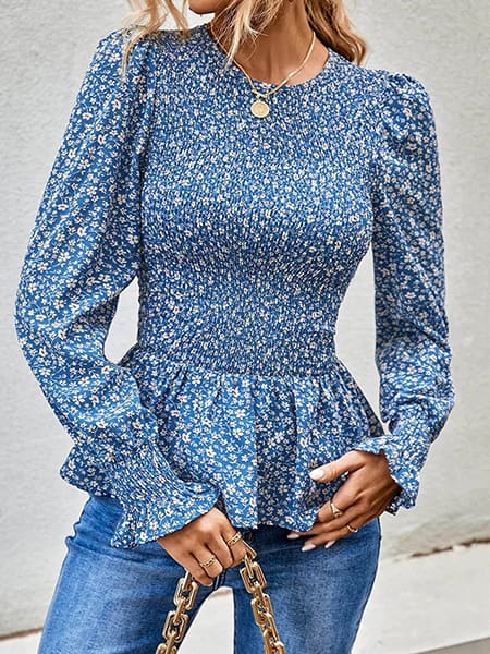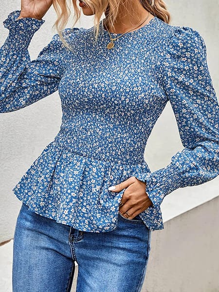 Une envie de changement dans votre style ? Laissez place à votre élégance et à votre personnalité de femme entreprenante en portant cette belle blouse fleurie bleue. On est toutes séduites par son tissu aux couleurs du ciel ainsi que par sa taille smockée qui marque la coupe peplum et valorise le galbe des hanches. Avec son col cheminé à volants et ses manches longues amples, elle sera idéale en hiver, mais aussi lors d’une fin de soirée d’été lorsqu’il commence à faire frais.