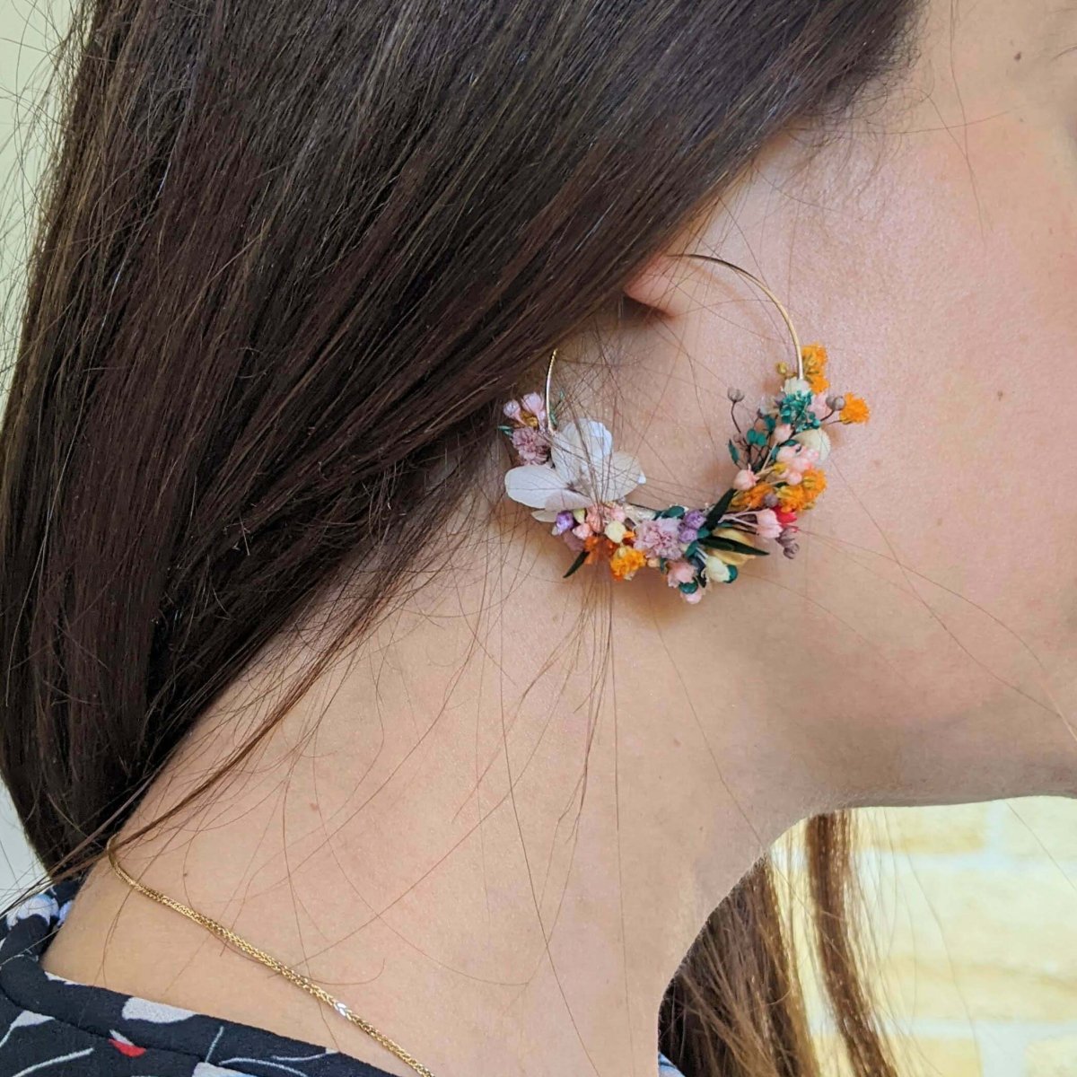 Les boucles d’oreilles Vaia s’inspirent des couleurs vibrantes de l’île de Java. Façonnées avec soin et passion, elles rehausseront votre tenue pour toutes vos festivités estivales. Composées de fleurs stabilisées, telles que hortensia, gypsophile, broom bloom, lepto, boton, phylica, lépidium, glixia, et lin, ces boucles d’oreilles apportent une touche unique. Montées sur un support en acier inoxydable, elles allient légèreté et élégance.