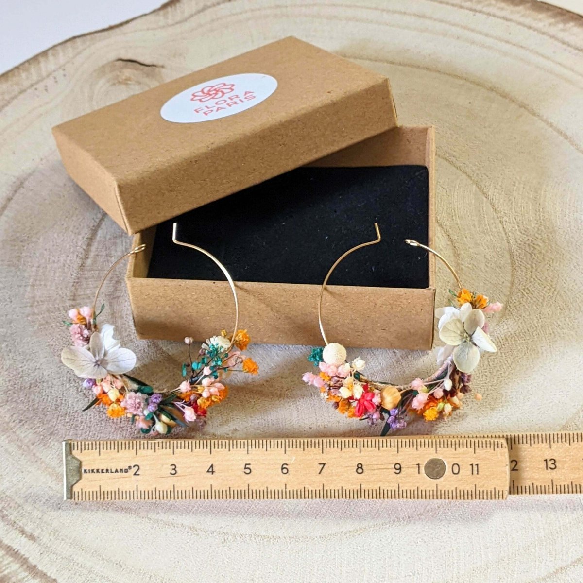 Boucles d’oreilles artisanales en fleurs stabilisées arc-en-ciel, Vaia