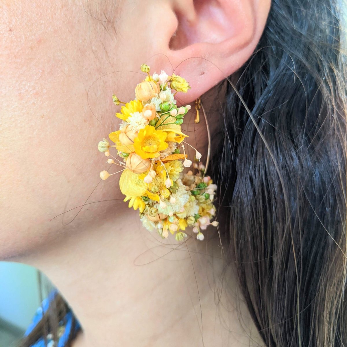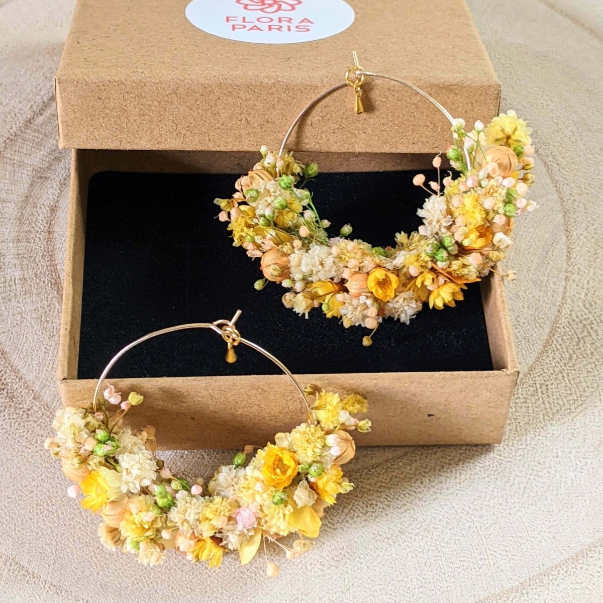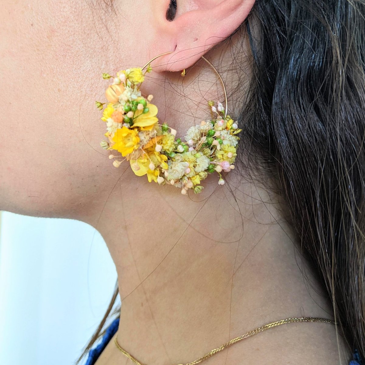 Les boucles d’oreilles Tiphaine sont une élégante création artisanale aux teintes pastel de jaune et de vert. Tiphaine viendra pimper votre tenue afin de vous accompagner lors de vos festivités estivales, ces créoles en acier inoxydable sont composées de fleurs stabilisées et séchées, notamment de l’hortensia, du gypsophile, du broom bloom, de la glixia et du lin. Confectionnées avec amour, elles apporteront une touche bohème et florale, idéale pour vos événements spéciaux ou pour un look chic au quotidien.