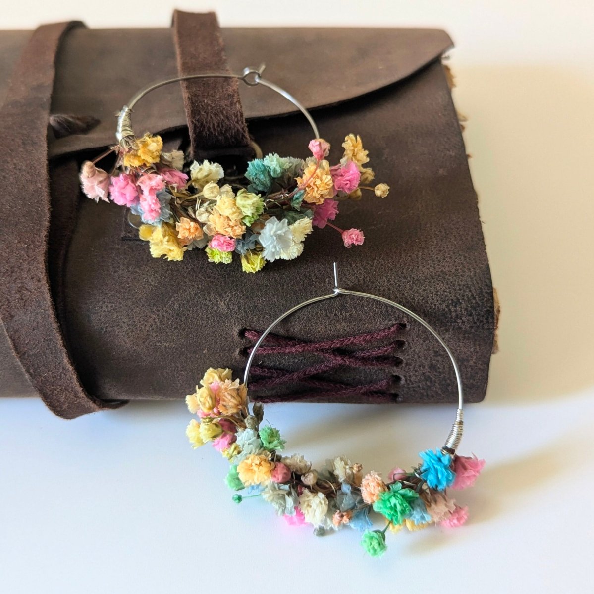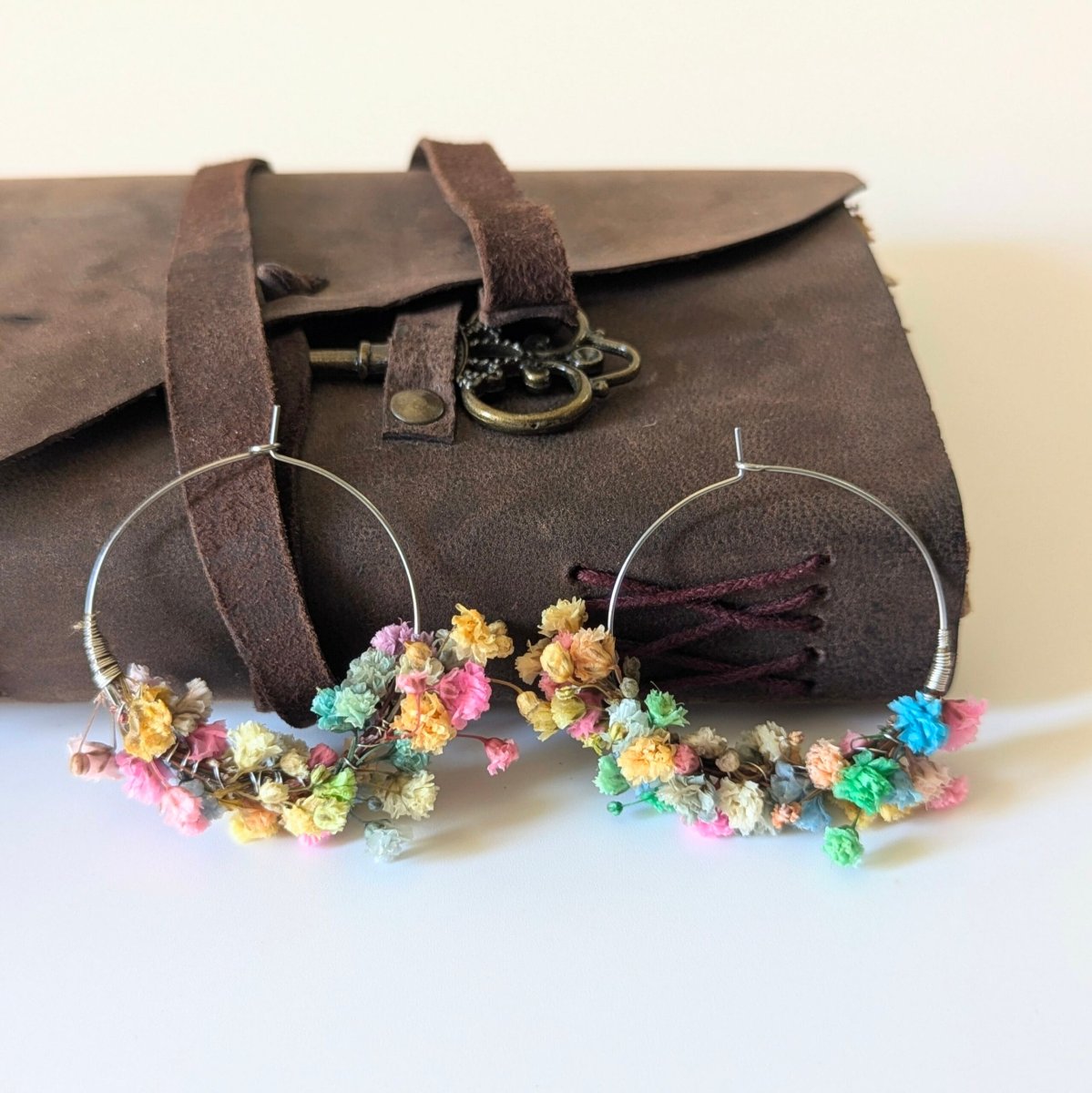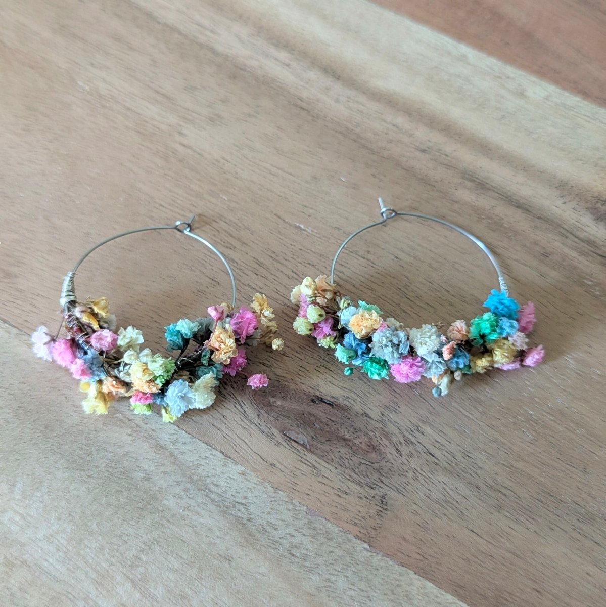 Légères, colorées et pleines de charme, les créoles Felicia apportent une touche florale joyeuse à toutes vos tenues. Réalisées à la main avec du gypsophile stabilisé multicolore, elles sont idéales pour un mariage, un festival ou un joli cadeau.