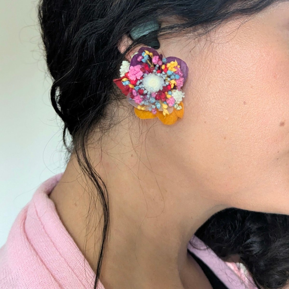 Apportez une touche de poésie et de fraîcheur à vos tenues avec ces boucles d’oreilles en forme de clous, entièrement composées de fleurs stabilisées. Chaque pièce est minutieusement assemblée à la main dans mon atelier Bordelais. Les teintes vibrantes de bleu, rouge, violet, jaune et blanc s’entrelacent délicatement pour créer un bijou à la fois raffiné, coloré et original. Légères et confortables, elles sont idéales pour sublimer un look bohème, romantique ou estival.
