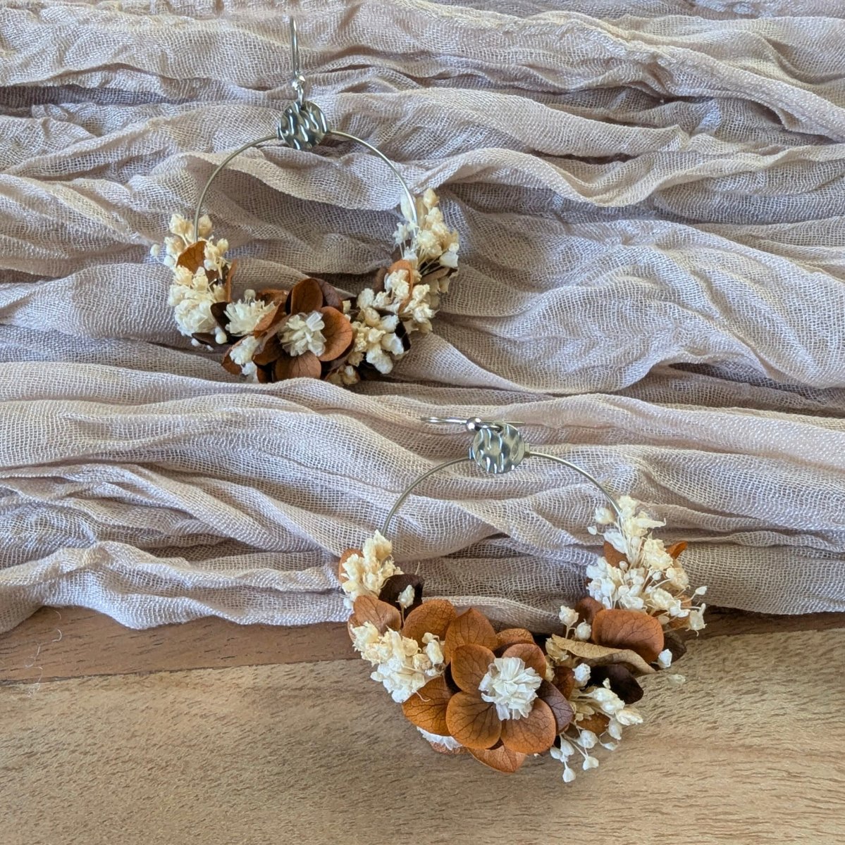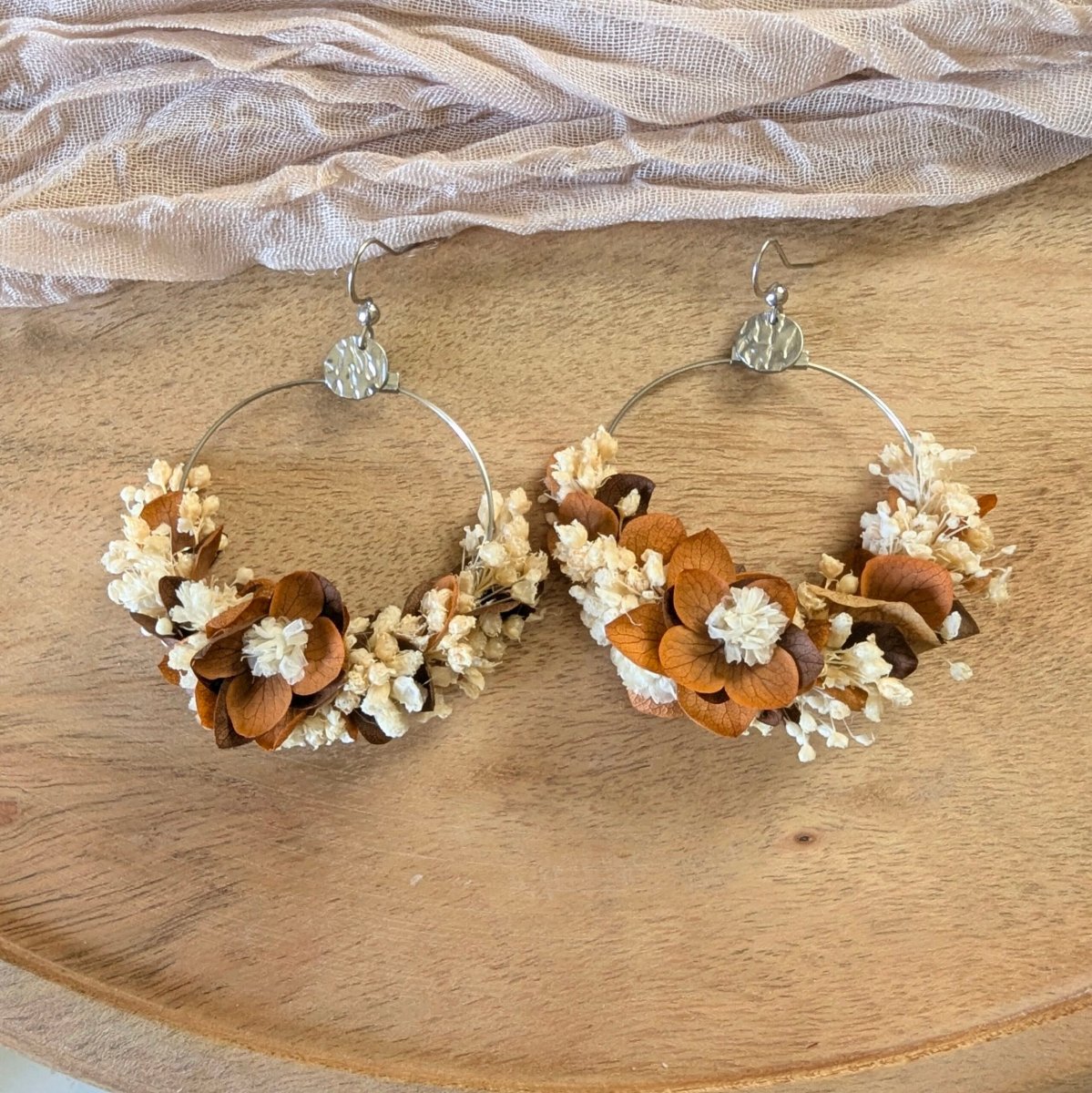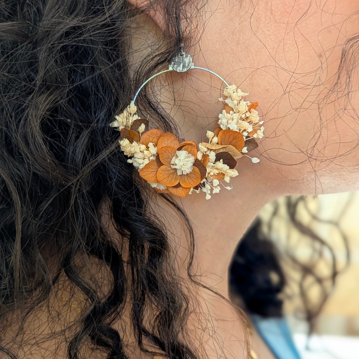 Les boucles d’oreilles Camille sont une véritable ode à l’automne. Inspirées des couleurs naturelles de cette saison beige doux, terracotta chaleureuse et touches orangées. Légères comme une caresse, elles se portent toute la journée sans gêne, apportant une note élégante et originale à votre style. Chaque pétale et fleur stabilisée est soigneusement assemblé à la main, ce qui en fait une pièce unique, pleine de poésie et d’authenticité. Ces boucles conviennent autant pour sublimer une tenue de mariage bohème que pour donner du caractère à un look quotidien. Leur harmonie de couleurs naturelles en fait un bijou intemporel, qui traverse les saisons avec raffinement.