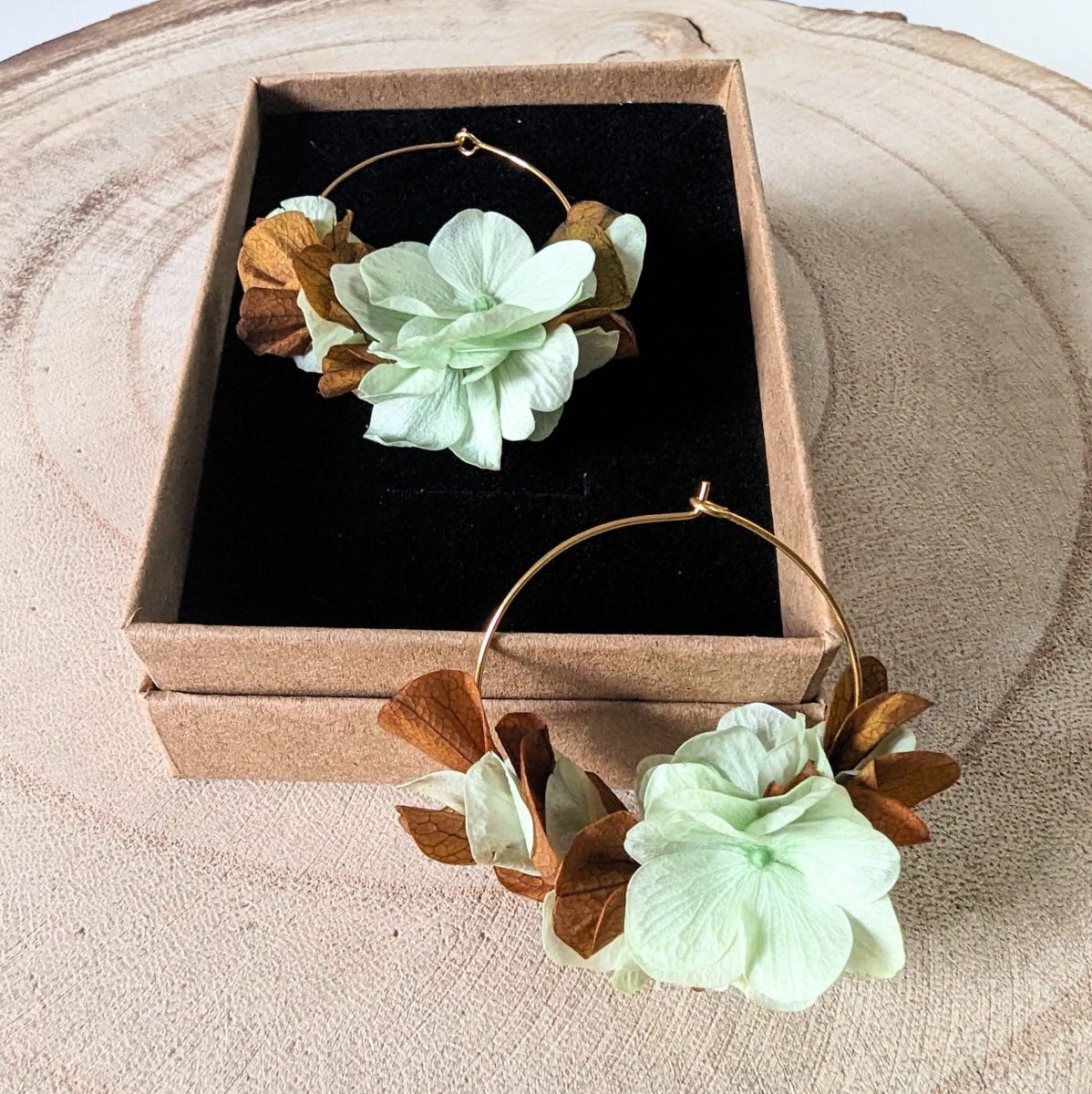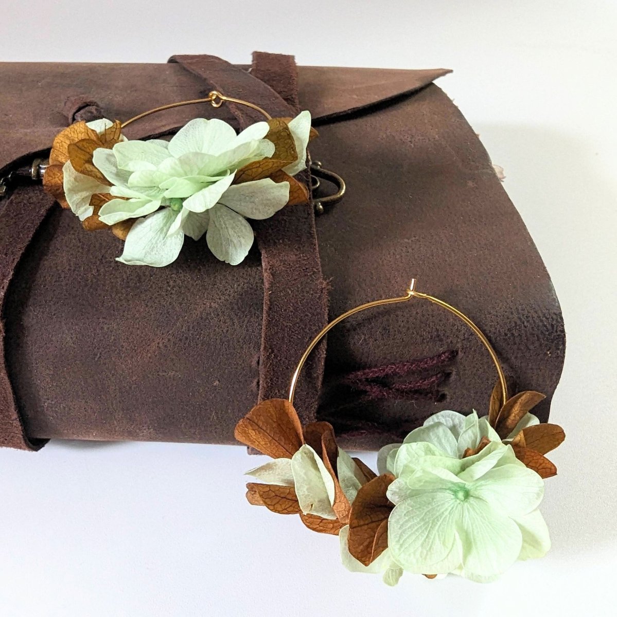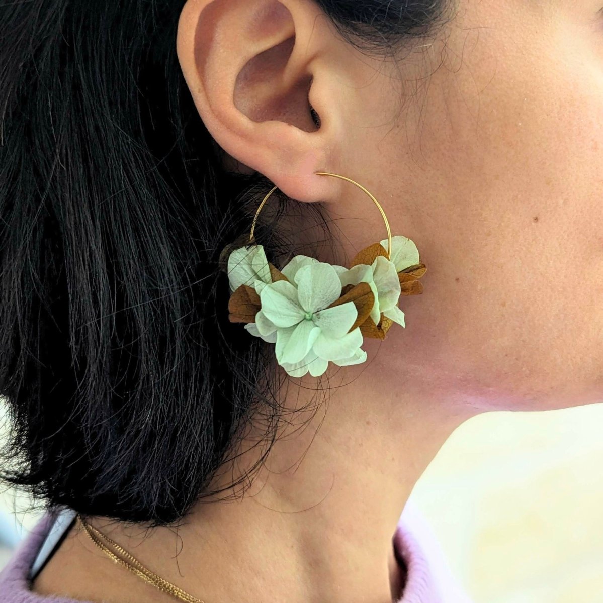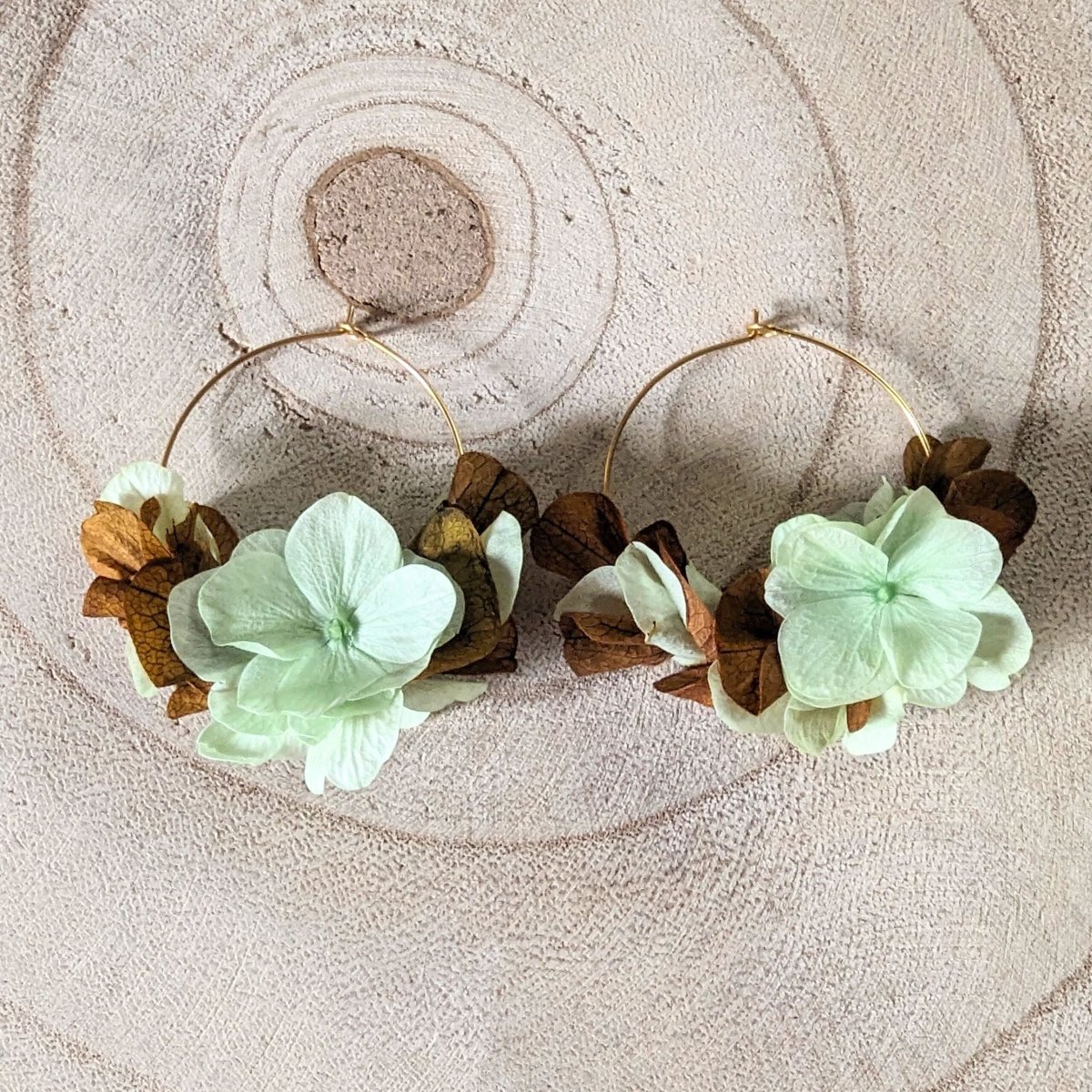 Boucles d’oreilles créoles en hortensias stabilisés aux couleurs menthe et marron, Anais