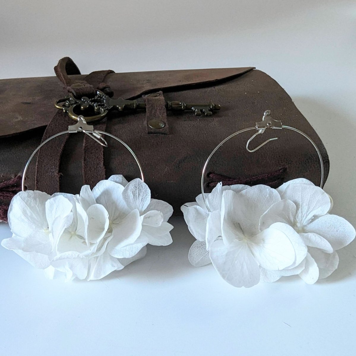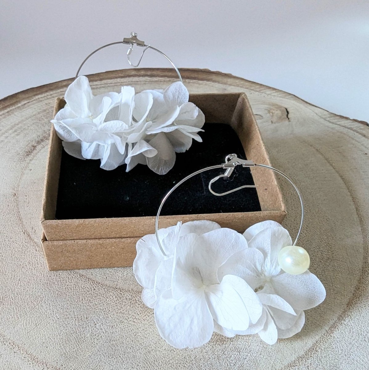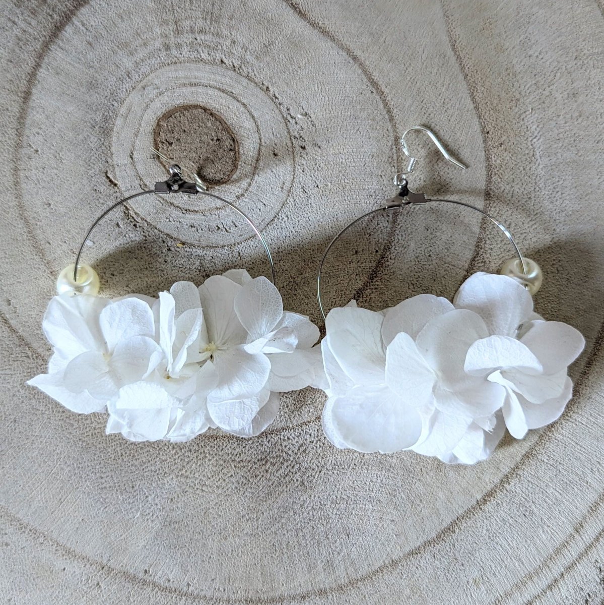 Boucles d’oreilles créoles en hortensias stabilisés blancs, Naëlle