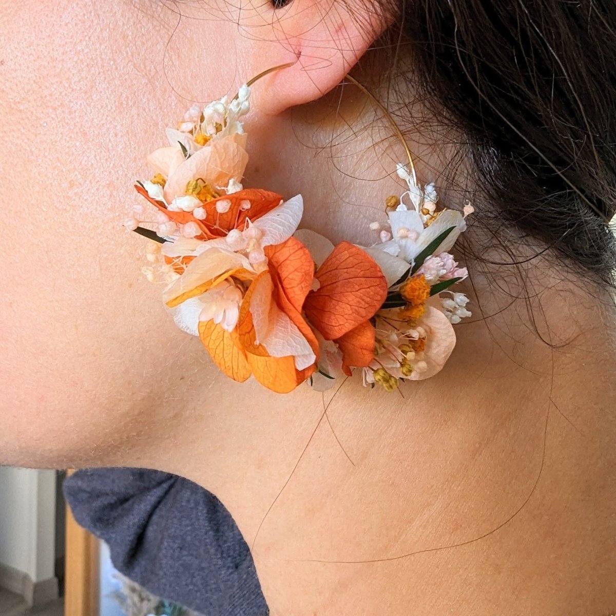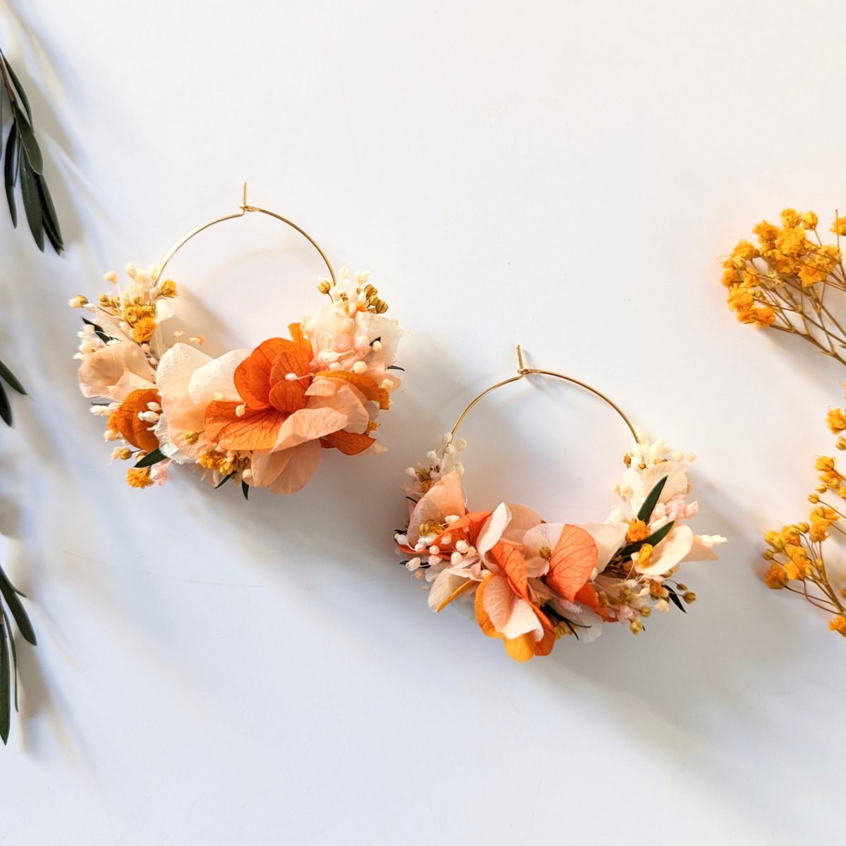 Boucles d’oreilles de mariée artisanales en fleurs séchées & stabilisées orangées, Chloé