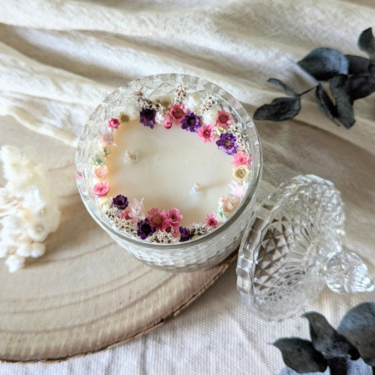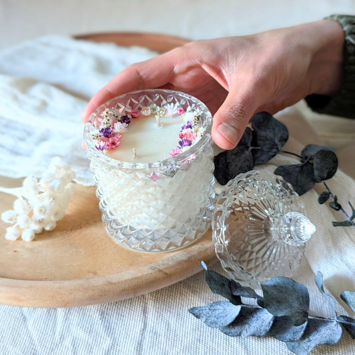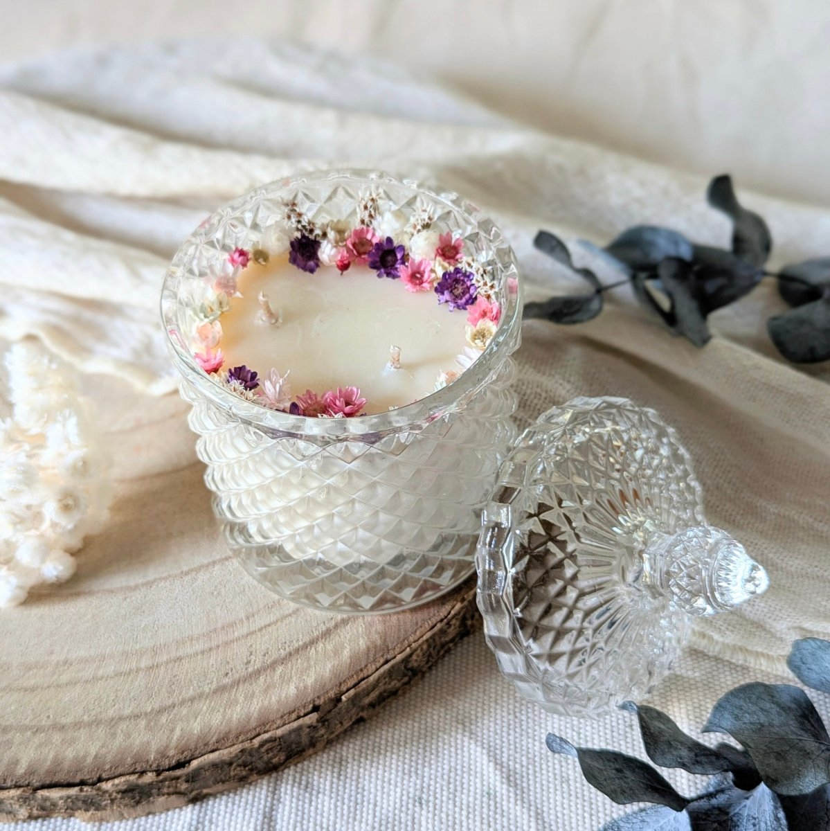 Une bougie artisanale au parfum de pivoine. Hanaé est joliment décorée par mes soins avec de de avec de belles fleurs séchées. Elle viendra embaumer vos pièces avec son parfum floral, créant une sensation de douceur. Cette bougie créera des moments cocooning pour se retrouver avec soi, décorer et embellir votre intérieur. La bougie est coulée dans une bonbonnière en verre transparent artisanale réutilisable. Mes bougies sont composées de cire de soja d’origine 100 % naturelle, non-OGM et biodégradable. Elle ne contient aucune substance nocive (CMR, phtalates, parabens, silicones, PEG). Sa mèche en coton bio offre une combustion propre et saine. Un cadeau distingué, écologique et idéal pour surprendre vos proches avec raffinement.
