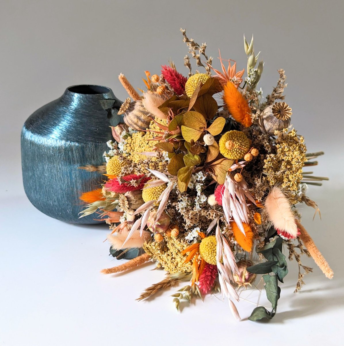 Victoire est un bouquet de fleurs naturelles séchées et stabilisées qui se veut élégant aux couleurs chaudes et délicates. Il apporte du soleil et une touche chaleureuse à votre décoration d’intérieur. Ce bouquet est composé de : Composé d’hortensias, craspédias, pavots, phalaris, lagurus, amarelino, eucalyptus, limonium, avoine, lin, negille, achillée, pampas, blé. Il est vendu avec ce magnifique vase en métal bleu.