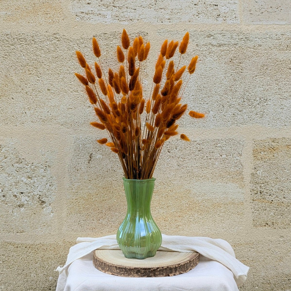 Bouquet de lagurus séchés orange brûlé avec vase en verre nacré, Flavie