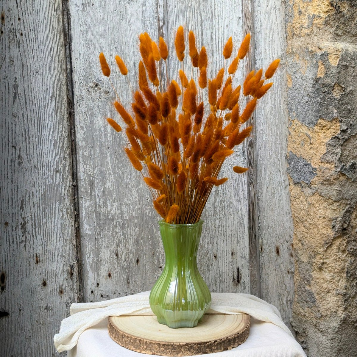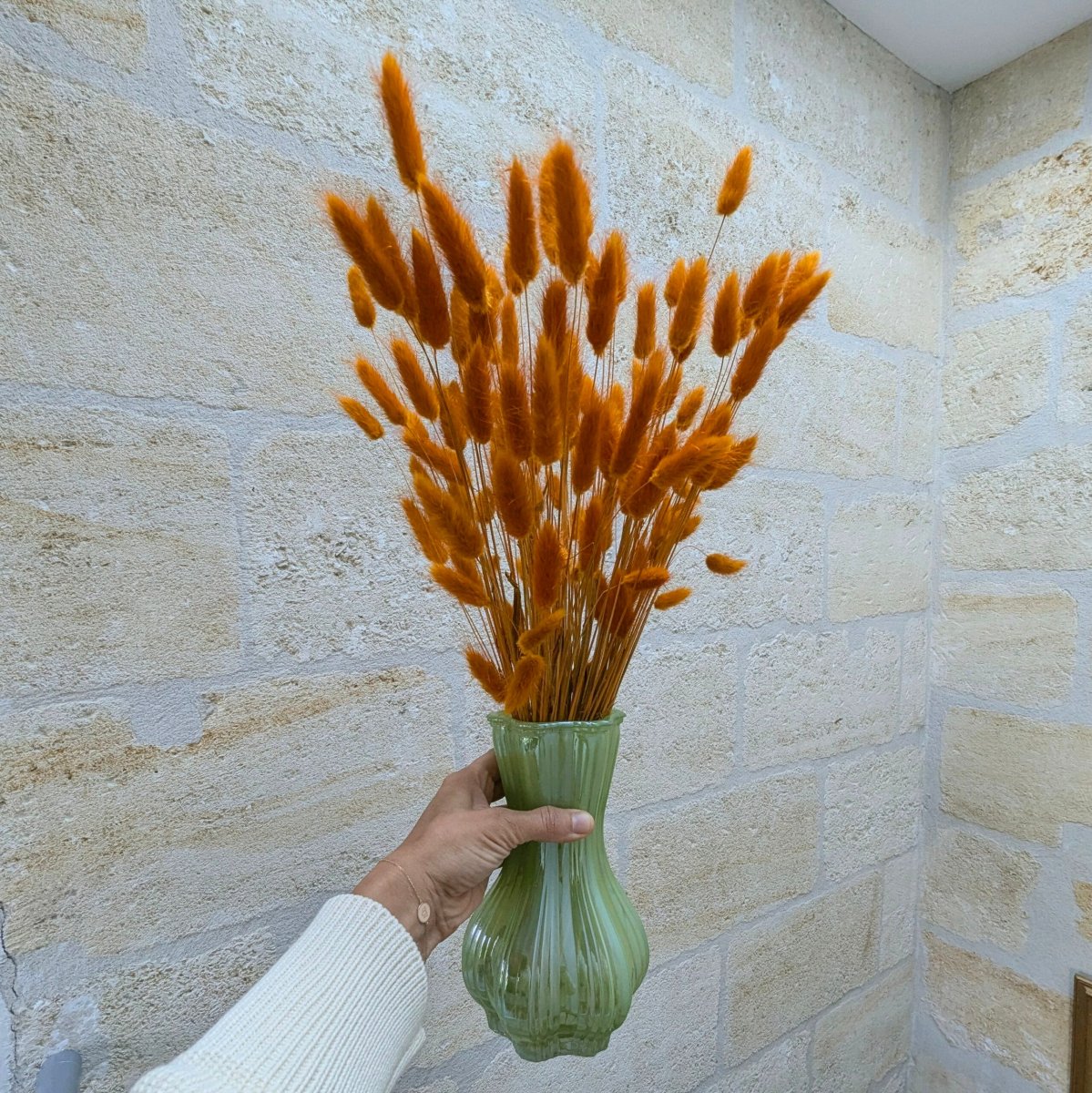Apportez une touche de chaleur automnale à votre intérieur avec ce bouquet de lagurus séchés aux teintes orange brûlé. Ces graminées légères et duveteuses évoquent la douceur des paysages d’automne et la gourmandise d’un caramel doré sous le soleil. Présenté dans un élégant vase en verre teinté vert clair nacré, ce bouquet conjugue style vintage et minimalisme contemporain. Chaque tige de lagurus, aussi appelée queue de lièvre, est soigneusement sélectionnée pour son éclat et sa texture soyeuse. Parfait pour habiller une étagère, une table ou une cheminée, ce bouquet durable ne nécessite aucun entretien. Sa palette chaleureuse illumine aussi bien un salon scandinave qu’un intérieur bohème, créant une atmosphère réconfortante et poétique. Idéal comme cadeau décoratif écoresponsable, ce bouquet incarne la simplicité et le charme intemporel du fait-main. Une pièce artisanale signée Flora Paris, pensée pour les amoureux de la nature, des ambiances rétro et des couleurs gourmandes.