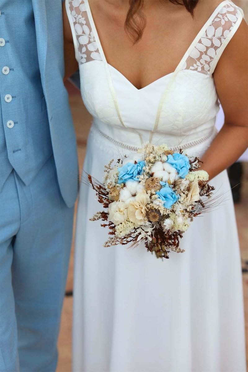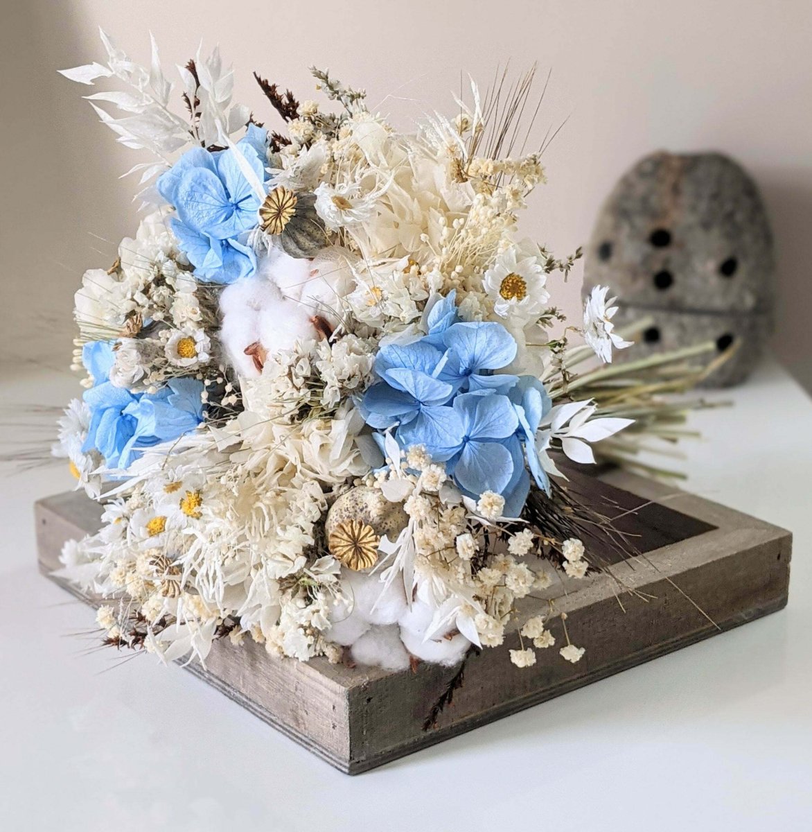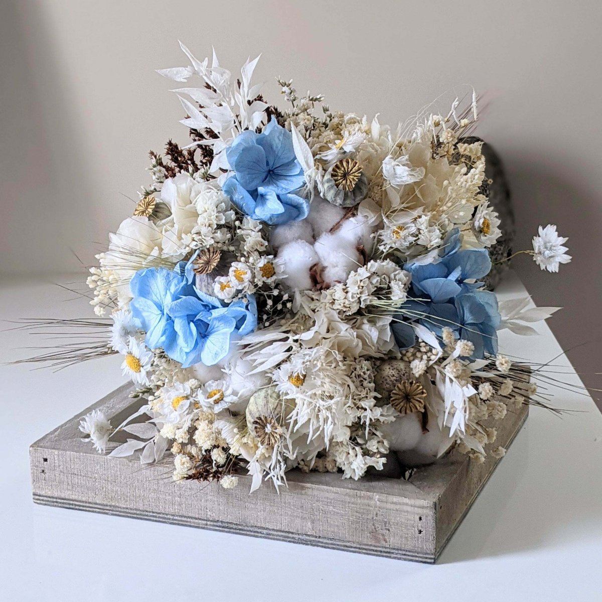 Bouquet de mariée avec fleurs de coton séchées et hortensias stabilisés bleu ciel, Jennifer