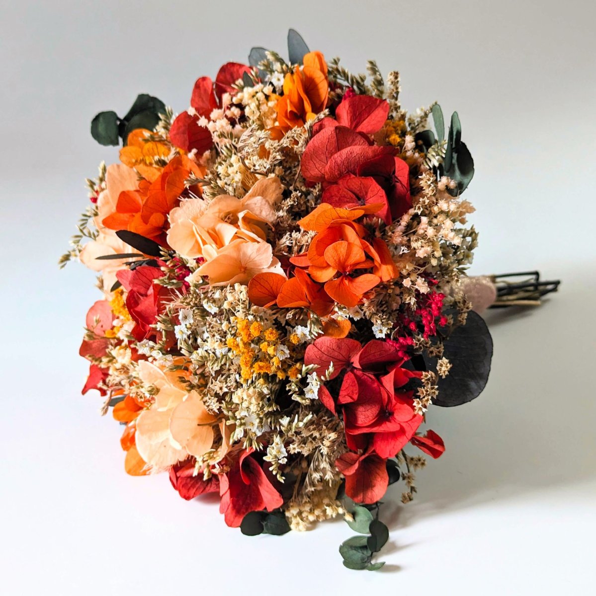Le bouquet de mariée Coco Cinelle se compose de fleurs stabilisées aux nuances éclatantes : rouges, oranges, vertes, beiges et roses. Ce bouquet floral artisanal unique « made in France » est assemblé avec minutie dans mon atelier bordelais.