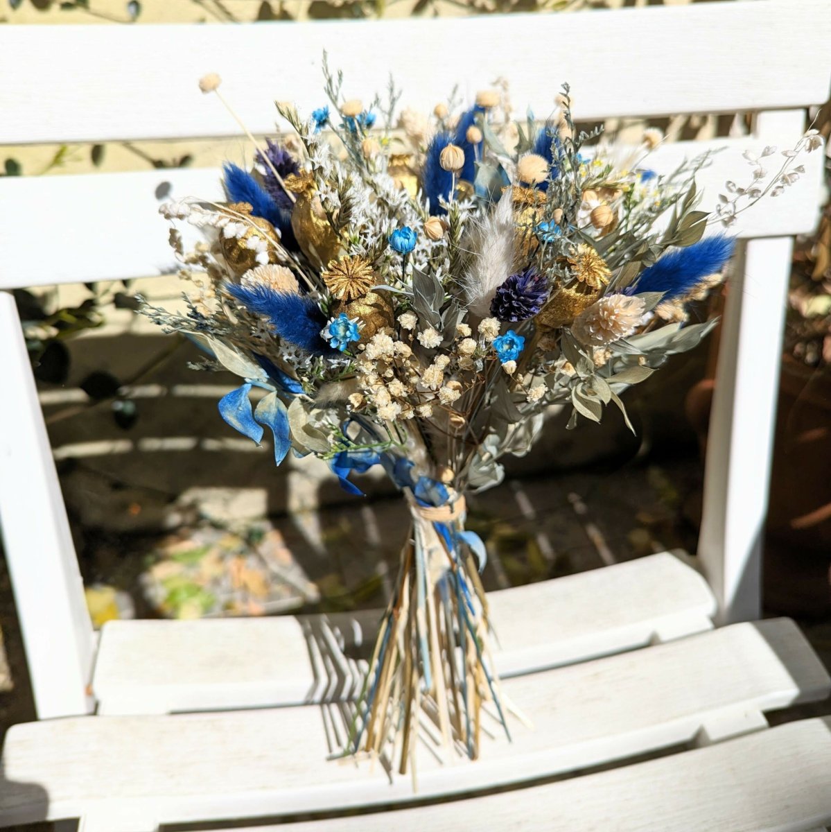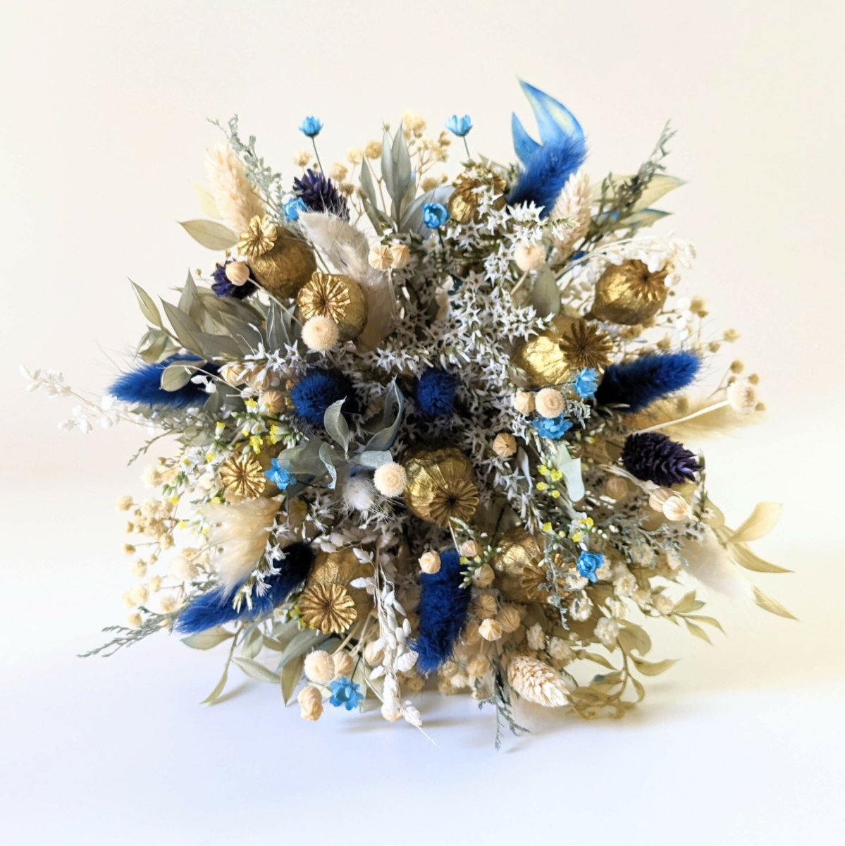 Bouquet de mariée en fleurs séchées & stabilisées dans les tons bleus, dorés et beiges, Elouise