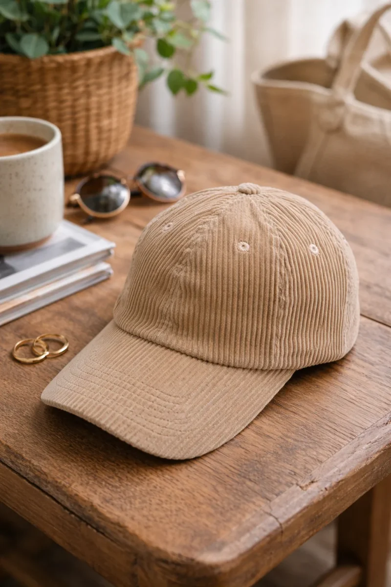 Baseball cap unisexe en velours côtelé. Bretelle réglable à l’arrière. 100% coton. Idéale pour la saison.