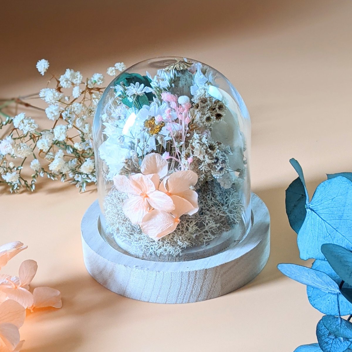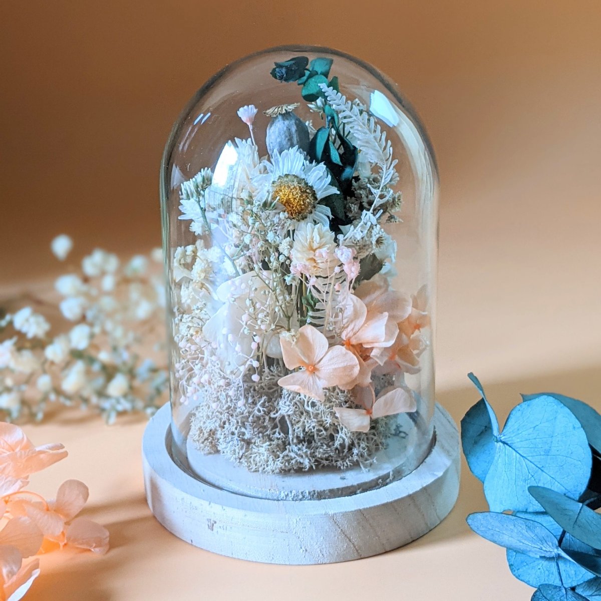 Cloche en verre avec fleurs éternelles pour décoration d’intérieur, Bella