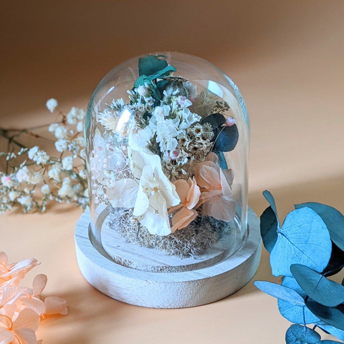 Cloche de fleurs stabilisées & fleurs séchées dans les tons bleus et verts, Arcachon