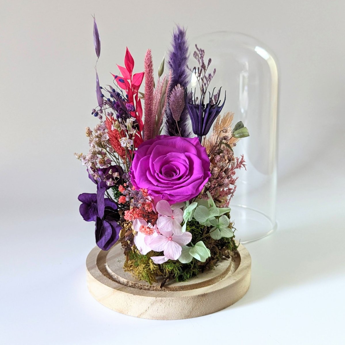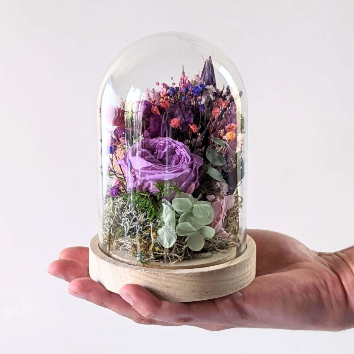 Cloche en verre avec fleurs éternelles pour décoration d’intérieur, Bella