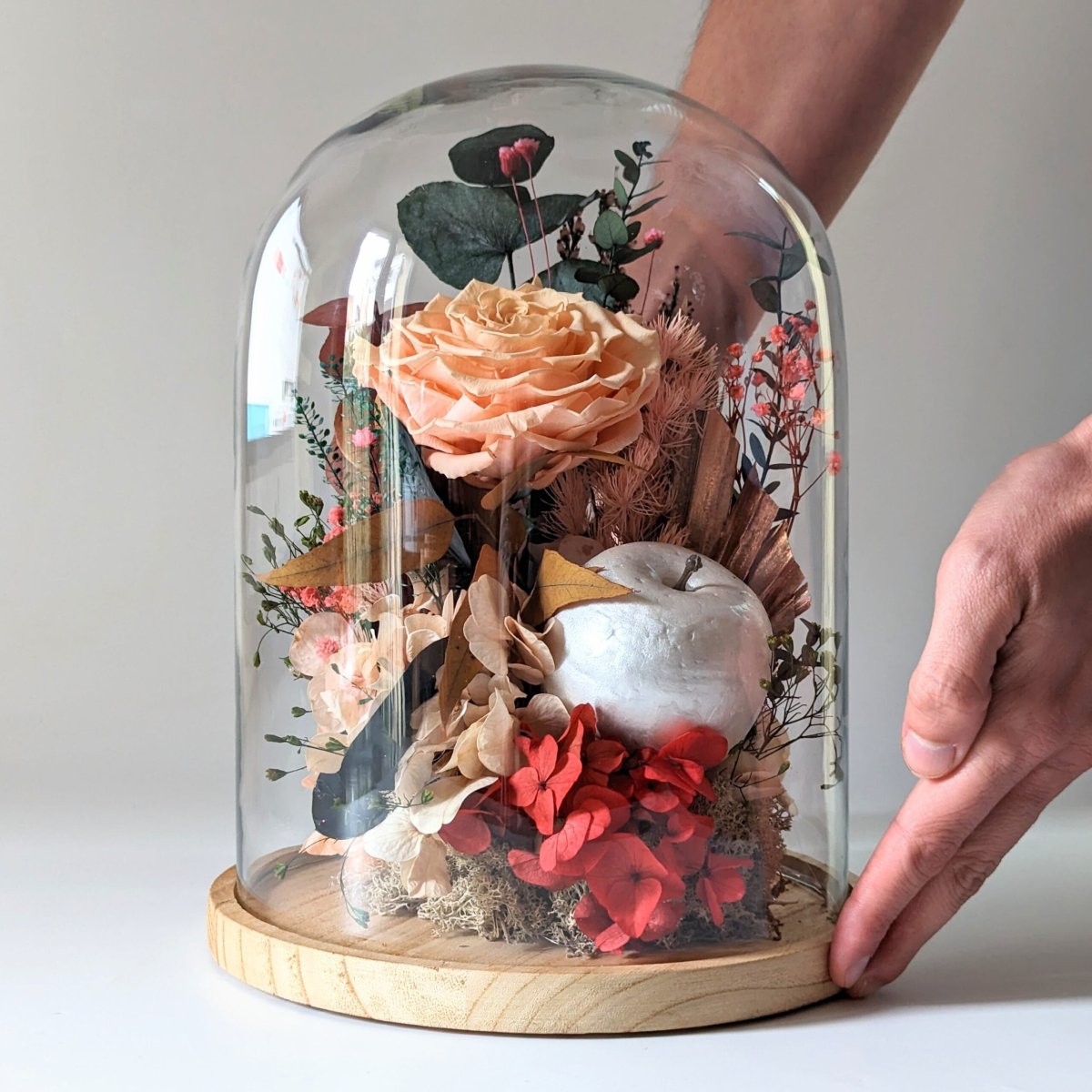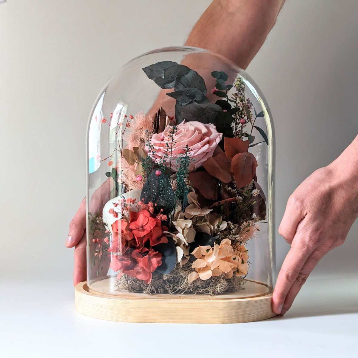 Cloche en verre avec rose éternelle et fleurs stabilisées, Eden