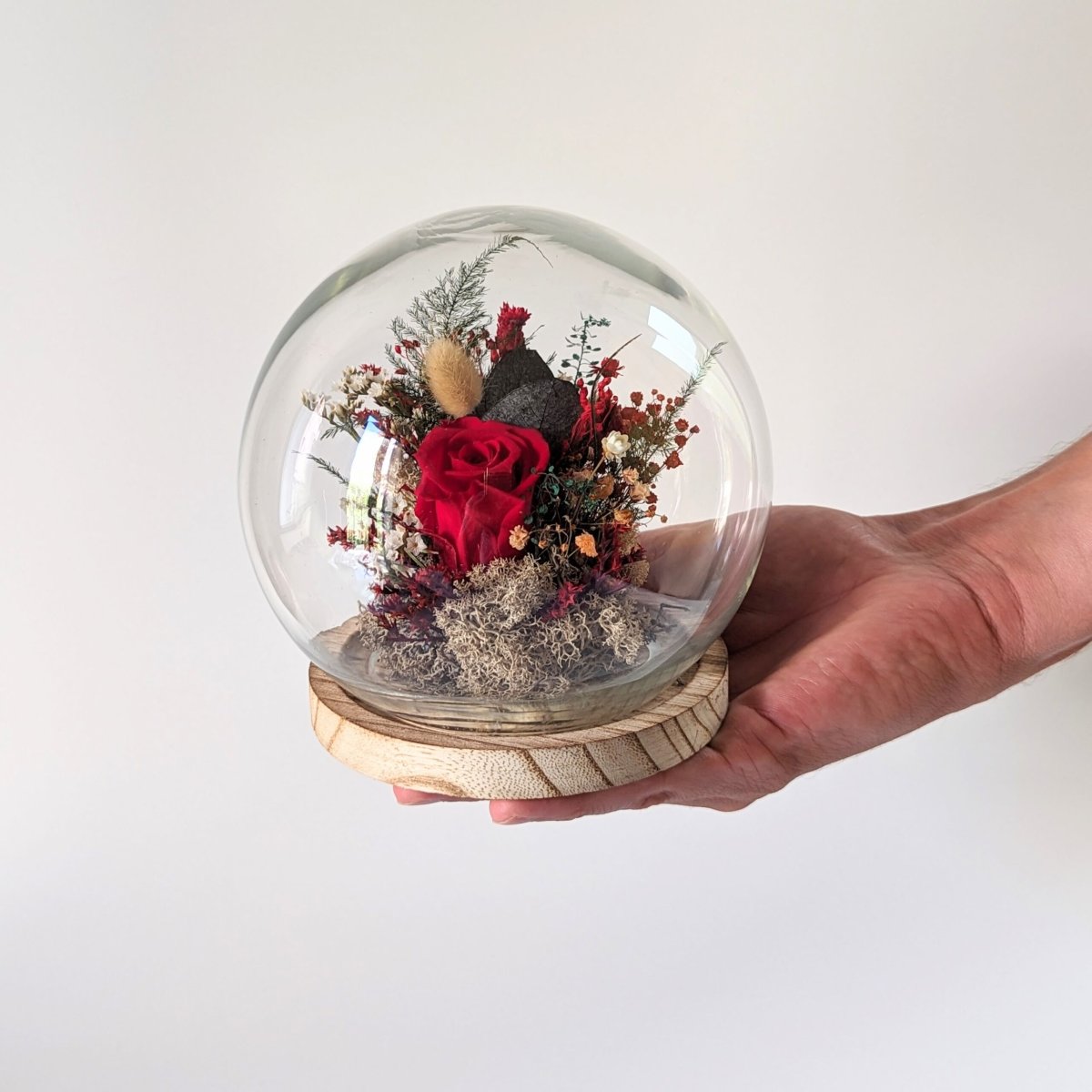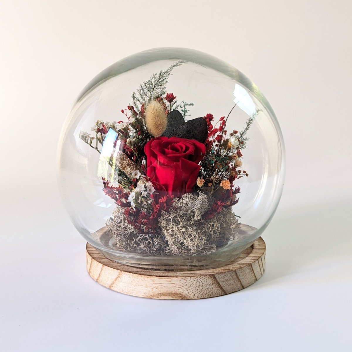 Cloche en verre avec fleurs éternelles pour décoration d’intérieur, Bella