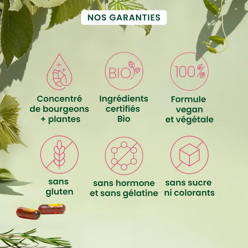 Composition : Macérats glycérinés de bourgeons d’airelle*, bourgeons de ginkgo biloba*, bourgeons de chêne*; eau; alcool* (<0.1%); extrait sec de maca racine; humectant : glycérol*; enrobage : hydroxypropylmethylcellulose.