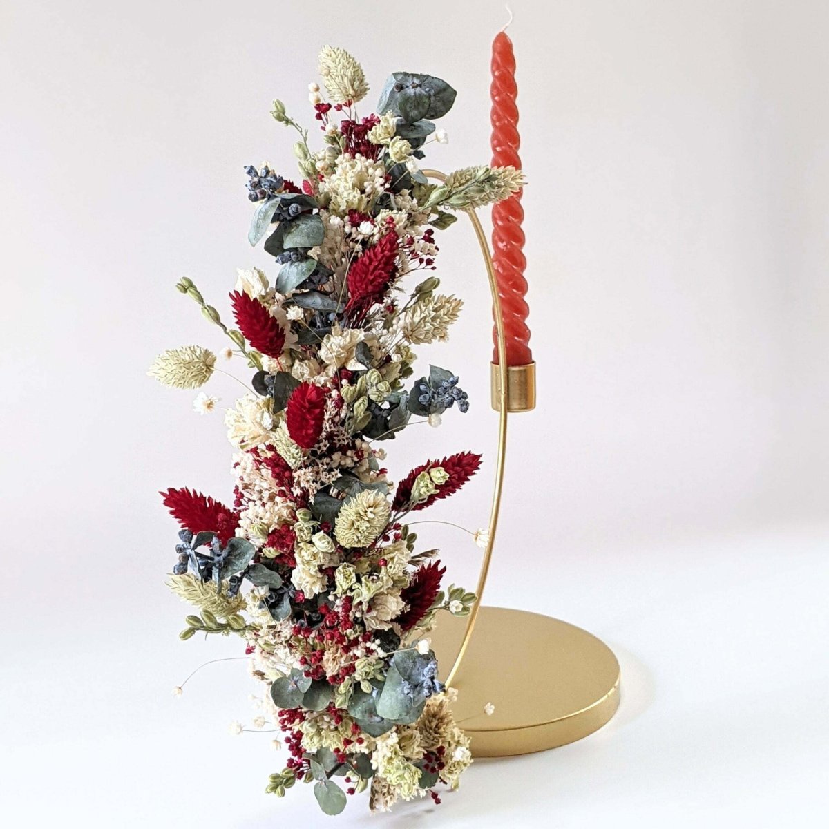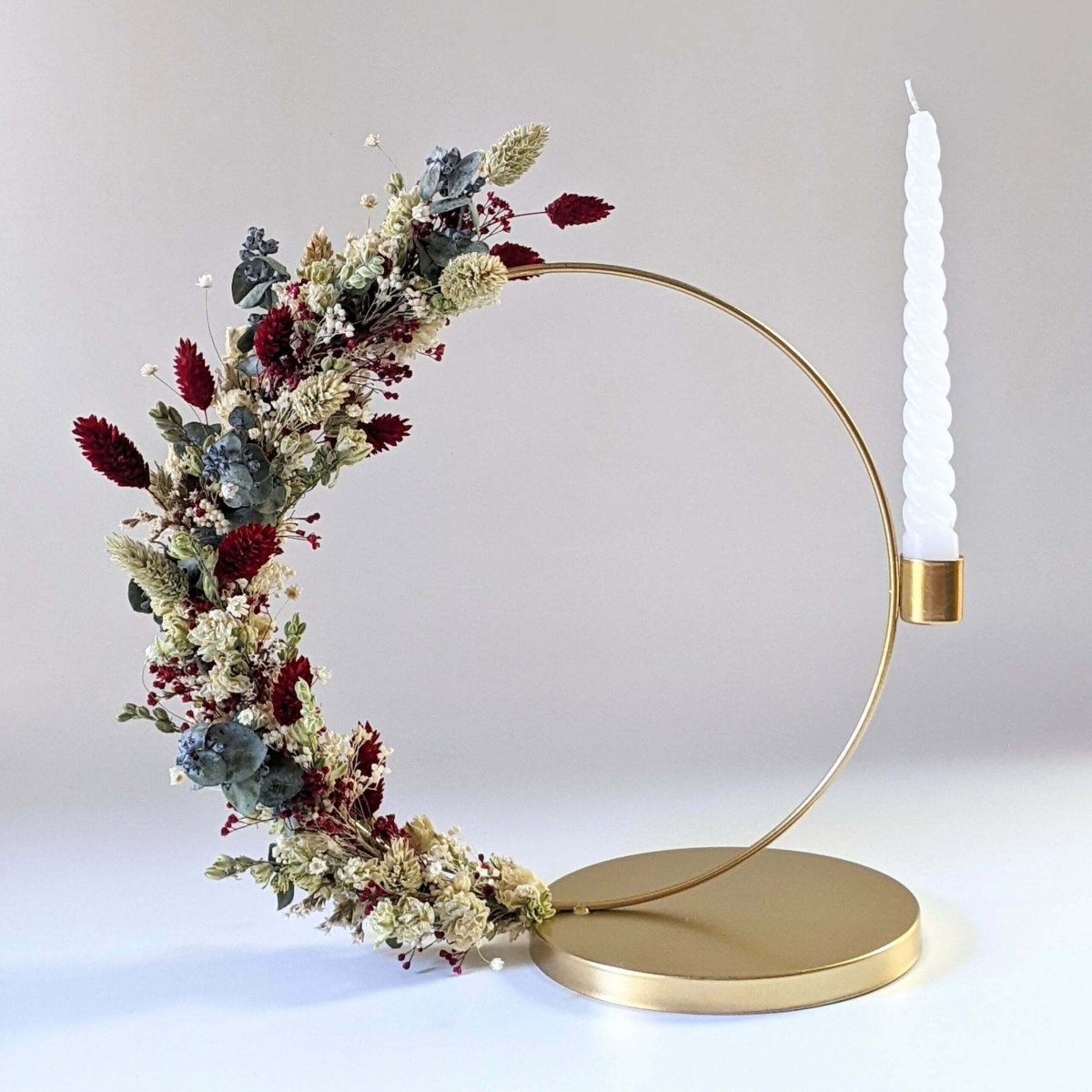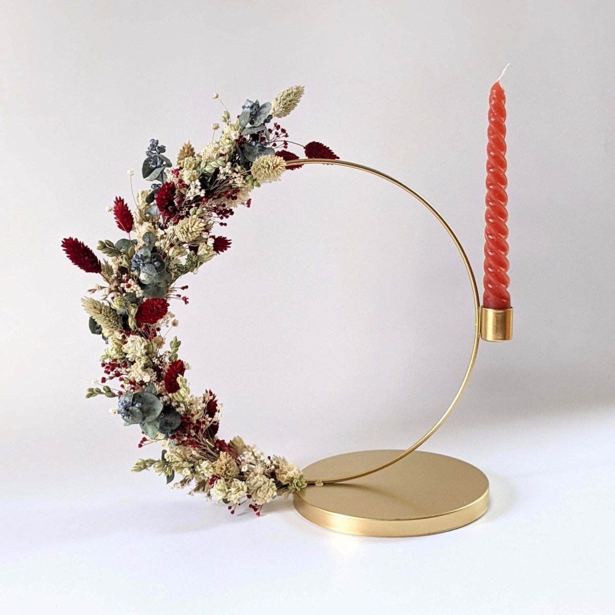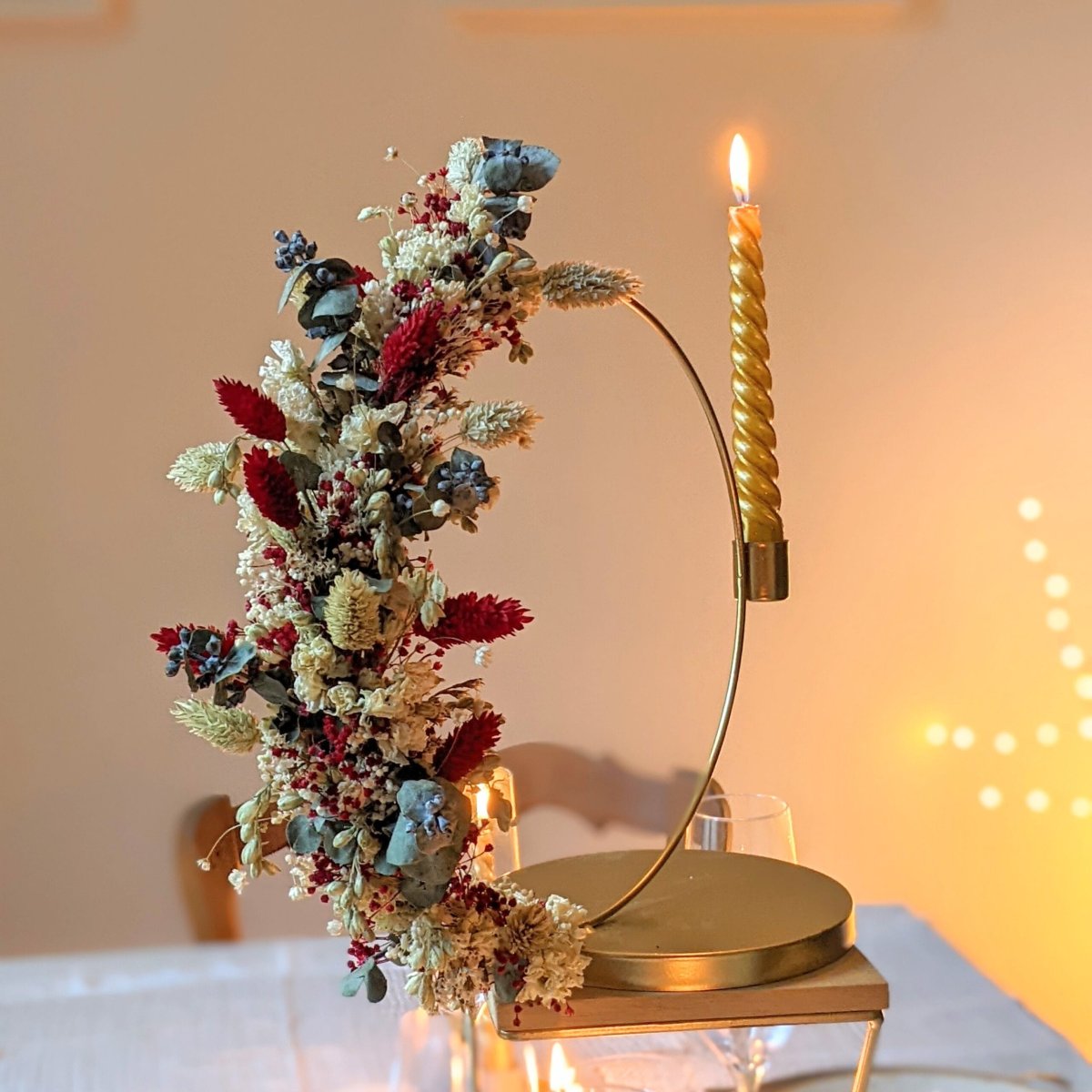 La couronne bougeoir Sofia vous invite à voir les fleurs séchées à la lumière d’une bougie. Il s’agit d’une couronne aux couleurs intemporelles, élégante et raffinée, un régal pour les yeux ! Elle mettra en lumière de façon originale la pièce dans laquelle elle se trouve. Sofia viendra fleurir durablement votre intérieur avec son support en laiton doré. Elle se posera facilement en centre d’une table ou sur une étagère, un meuble, une commode, une cheminée… La couronne est livrée avec une bougie blanche ou corail.