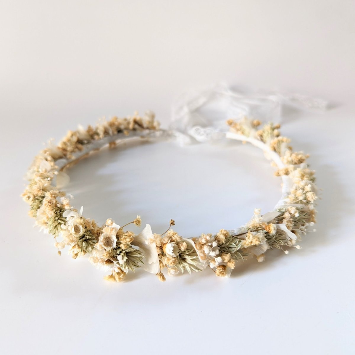 Sublimez votre coiffure en ce grand jour avec la couronne de fleurs séchées et fleurs stabilisées Luna. Ce bijou apportera à votre tenue une touche de douceur et d’élégance pour être au plus près de l’image souhaitée. Cet accessoire de cheveux est composé de : hortensia, broom bloom, gypsophile, glixia, phalaris. La couronne de cheveux est livrée dans sa boite en kraft avec du papier de soie.