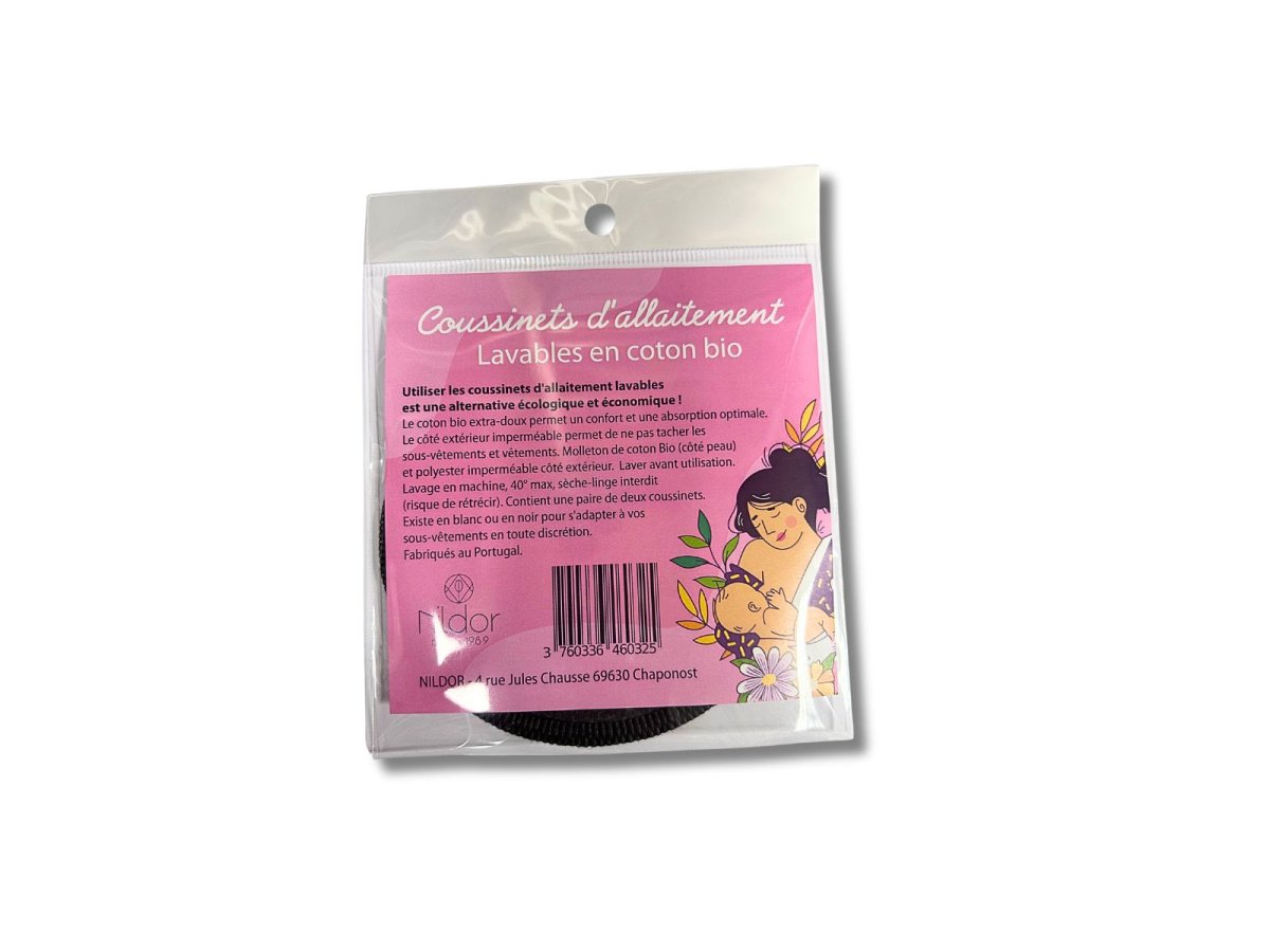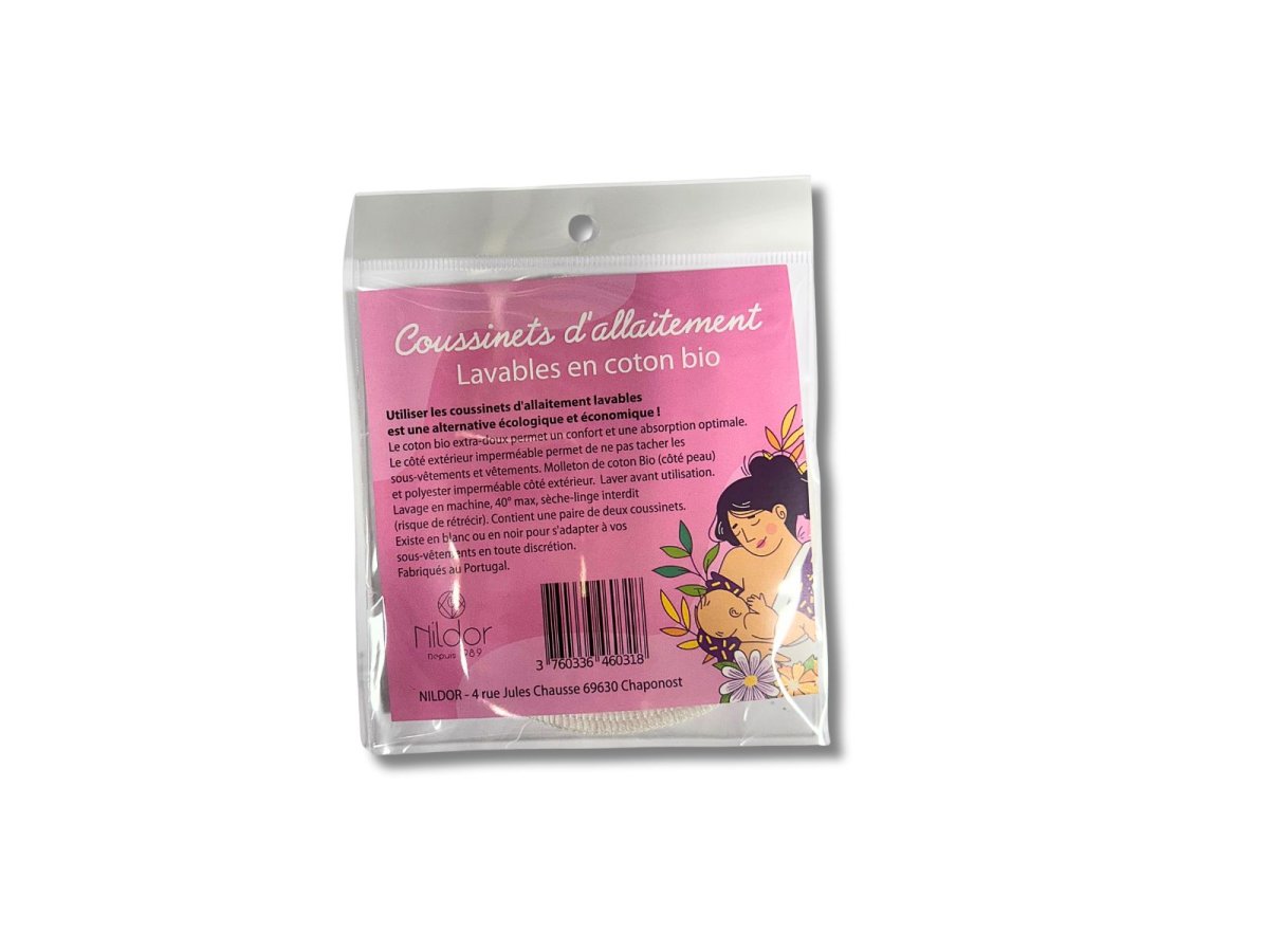 Afin de compléter sa gamme MATERNITE, le laboratoire NILDOR vous propose un sachet de deux coussinets d’allaitement lavables en coton Bio et polyester imperméable. Deux couleurs sont disponibles: blanc et noir pour s’adapter en toute discrétion aux sous-vêtements d’allaitement. Le coton Bio extra-doux permet un confort et une absorption optimale. Le côté extérieur imperméable permet de ne pas tacher les sous-vêtements et vêtements. COMPOSITION: * Une face en molleton 100% coton biologique (côté peau) * Une face en 100% Polyester imperméble respirant (côté extérieur) UTILISATION: * Laver avant utilisation * Lavage en machine, 40° maximum, sèche linge interdit (risque de rétrécir) Fabriqués…