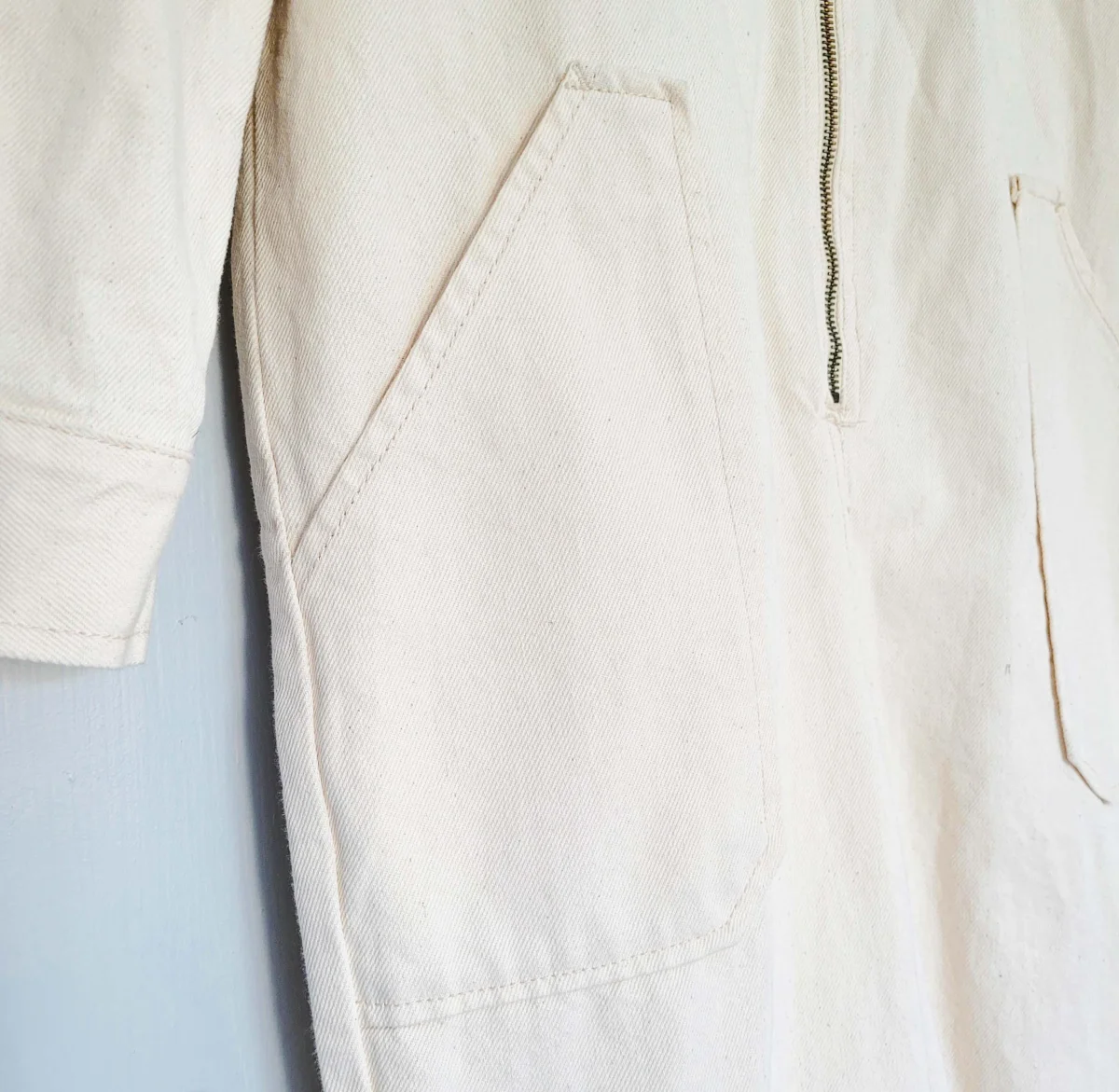 New American vintage suit in ecru denim, in the back we have hand-embroidered in chain stitch an original logo of an Indian dealer from the 1940s. On a front pocket, an AMA (American Motorcycles Association) patch. On one sleeve a patch of one of the first Indian Motocycles logos. More than three hundred hours were needed to embroider the back and the front.