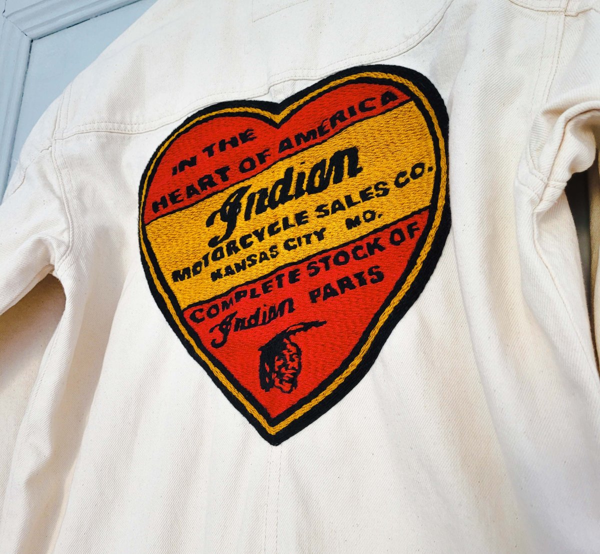 Combinaison neuve American vintage en denim écru, dans le dos nous y avons brodé à la main au point de chaînette un logo original d’un dealer Indian des années 40. Sur une poche avant, un patch AMA (american Motorcycles Association). Sur une manche un patch d’un des premiers logos d’Indian Motocycles. Plus de trois cent heures ont été nécessaires pour broder l’arrière et l’avant.
