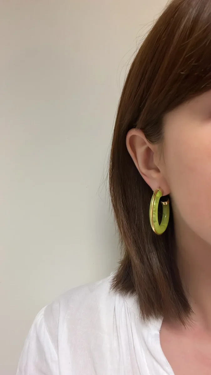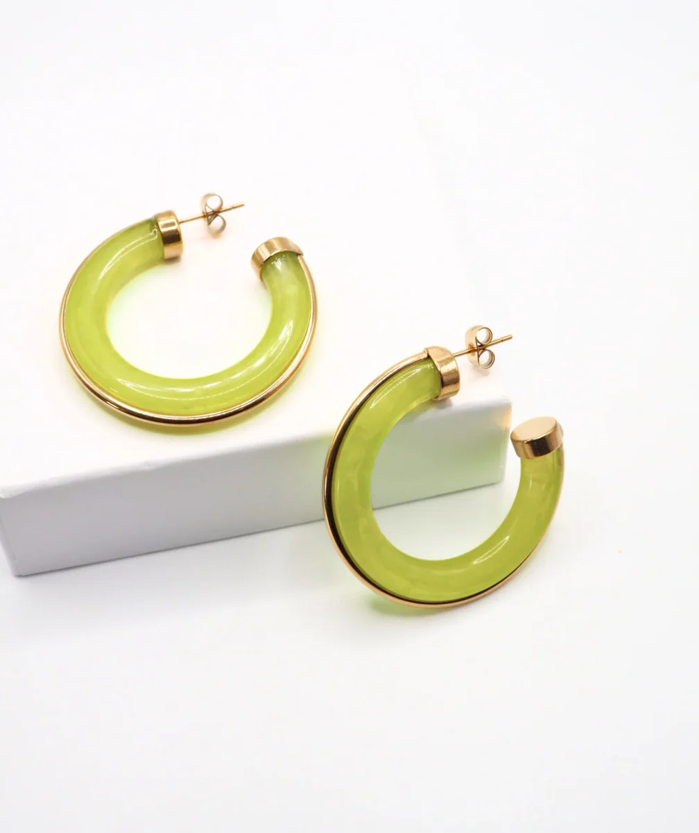 Osez la couleur avec ces créoles en résine vert anis ! Audacieuses et originales, elles insufflent une énergie joyeuse à votre tenue. Le contraste entre la résine colorée et les finitions dorées apporte une touche chic.