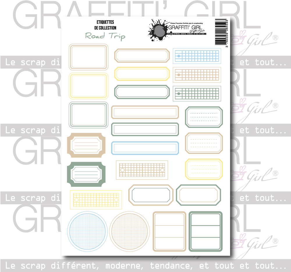 Nom : étiquettes Road Trip Produit : Die-cut Taille : 14,8cm x 21cm Marques : Graffiti Girl Collection : Road Trip Utilisation : Des jolis chipboards à découper et à coller comme embellissements dans vos projets de scrapbooking